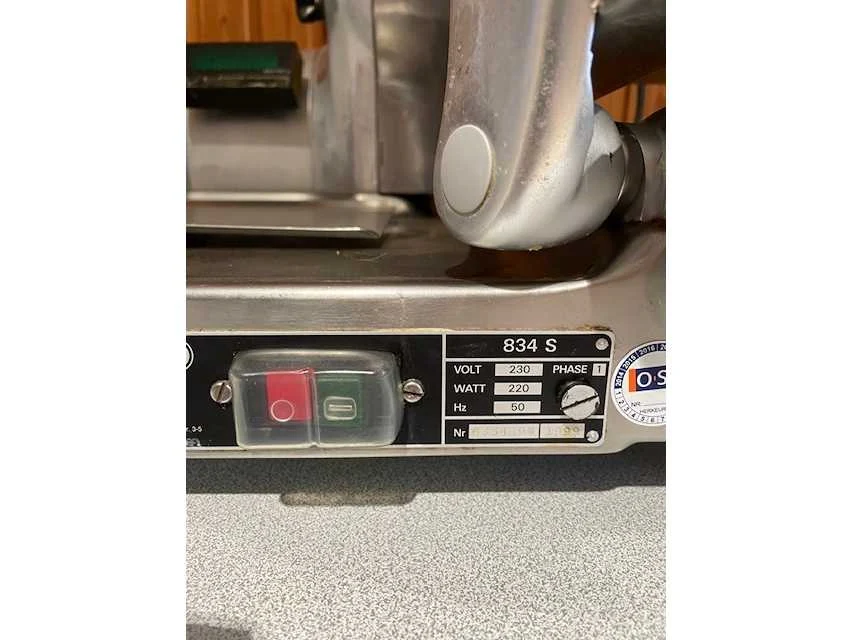Professionele snijmachine voor vlees, kaas, groenten; met controleweegschaal; ingebouwd slijpapparaat; Merk: Berkel Type: 834 S Bouwjaar: 1999 Diameter snijblad: 300mm Messlijper: true Max. snijdikte: 240mm Aansluiting: 230V