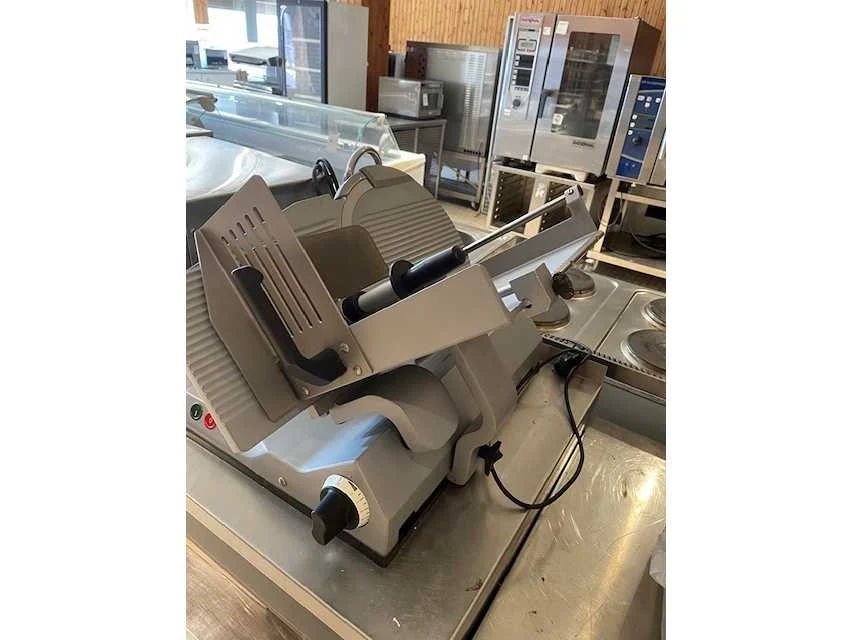 Professioneel snijmachine; schuin model; slijpapparaat apart; veilige uitvoering; prima staat; Merk: Graef Type: Euro 3370 FL Bouwjaar: 2013 Diameter snijblad: 330mm Messlijper: true Max. snijdikte: 300mm Aansluiting: 230V Eigen gewicht: 40kg Totale afmeting L: 660mm Totale afmeting Breedte: 620mm Totale afmeting Hoogte: 470mm