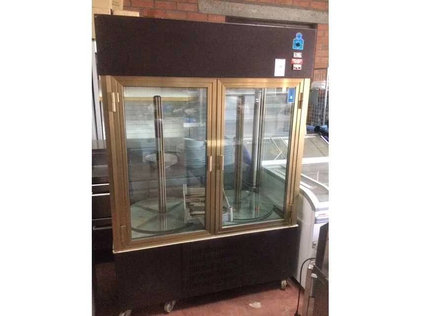 Roterende dubbele taartenkoeler; carrousel voor gebak te presenteren; Eigen gewicht: 150kg Totale afmeting L: 1360mm Totale afmeting Breedte: 720mm Totale afmeting Hoogte: 1940mm