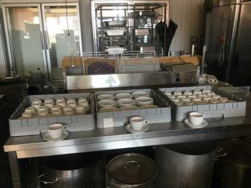Ca 200 koffiekoppen met bijhorende bordjes; inclusief afwasmanden;