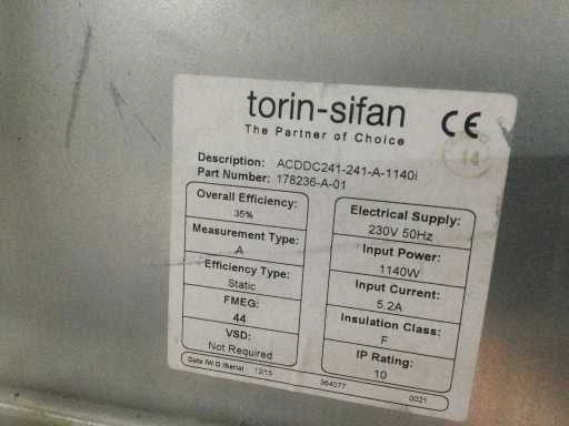 Centrifugaal ventilator 3250m³; 230V; 1140W; ca 37x40x37cm; Merk: Torin Sifan Model: ACDDC241-241 Type: 3250m³
