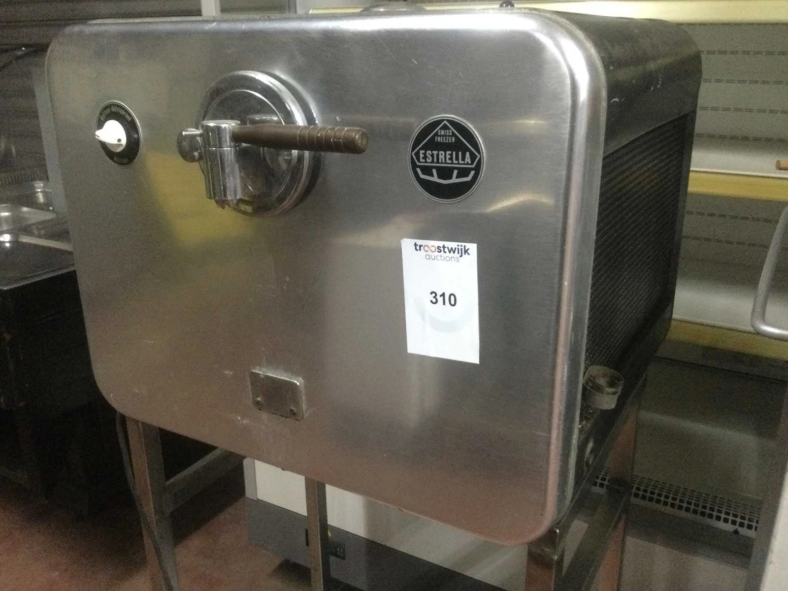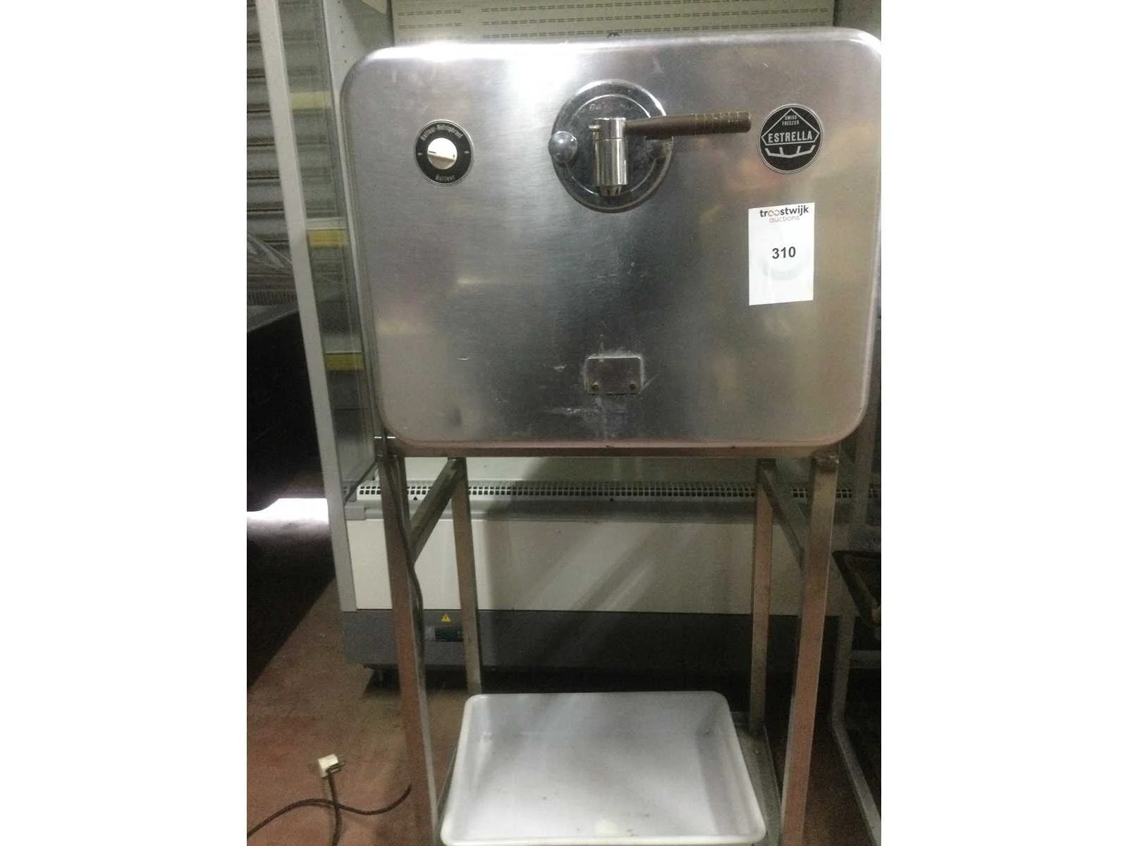 Antieke roomijsmachine; werkend; op rvs mobiele voet; Merk: Estrella Aansluiting: 230V Eigen gewicht: 70kg Totale afmeting L: 650mm Totale afmeting Breedte: 600mm Totale afmeting Hoogte: 500mm