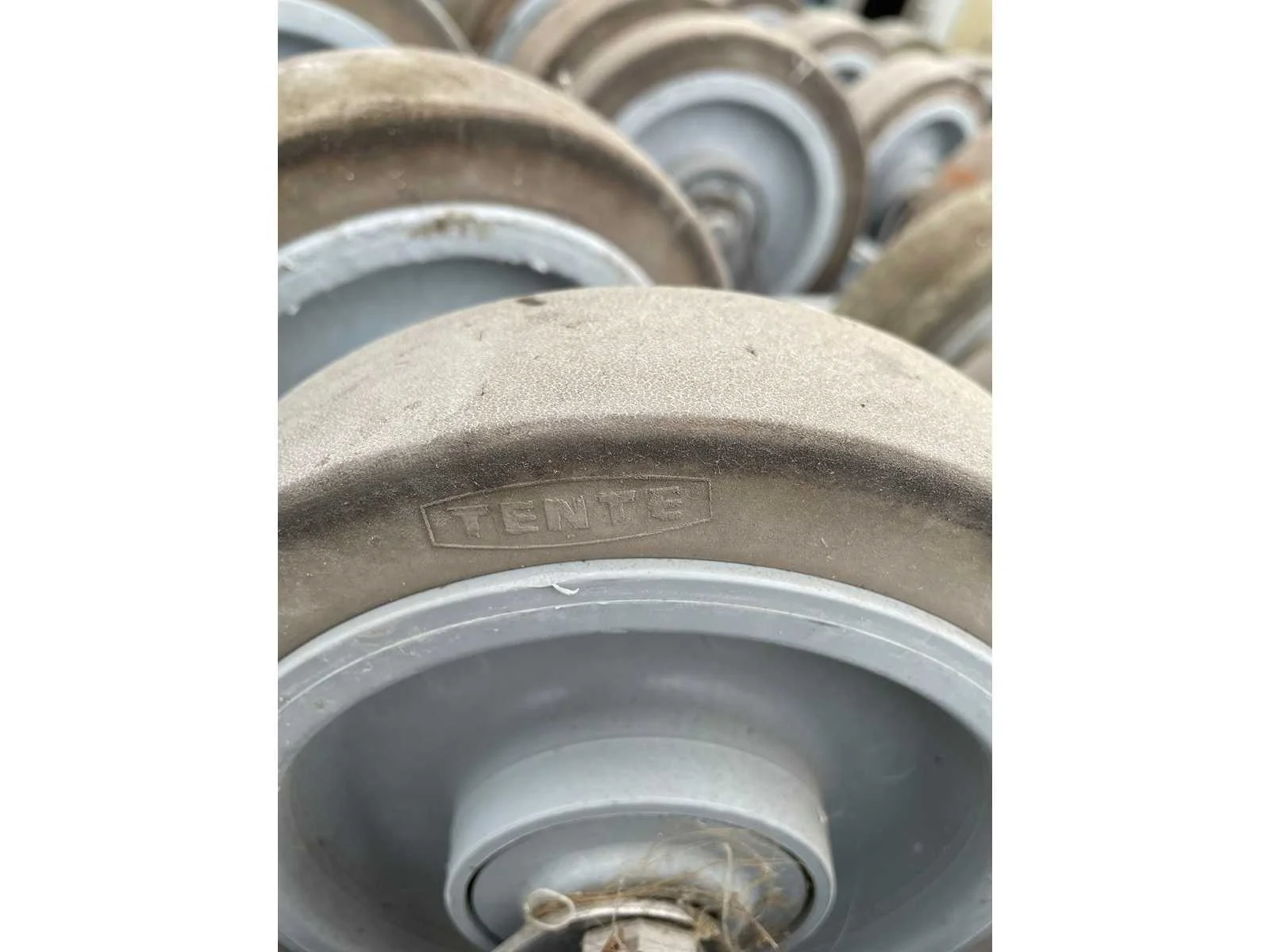 Bestaande uit : 8 wielen, waarvan 4 zwenkwielen met rem; vork in rvs; plaatbevestiging; niet-strepende, elastische rubberband; draagkracht 400kg; met bak; Merk: Tente Type: U200 Totale afmeting L: 200mm Totale afmeting Breedte: 46mm Totale afmeting Hoogte: 240mm