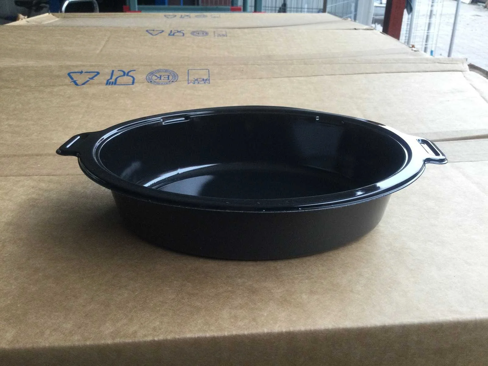 Pallet verpakkingsmaterialen plastic; ovaal; -40 tot 220°C; 12 kartonnen dozen; 560 bakjes per doos; Merk: Faerch Type: C1219-1A Lengte: 22cm Breedte: 16cm Hoogte: 4cm
