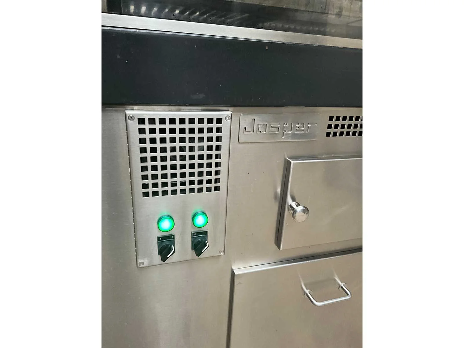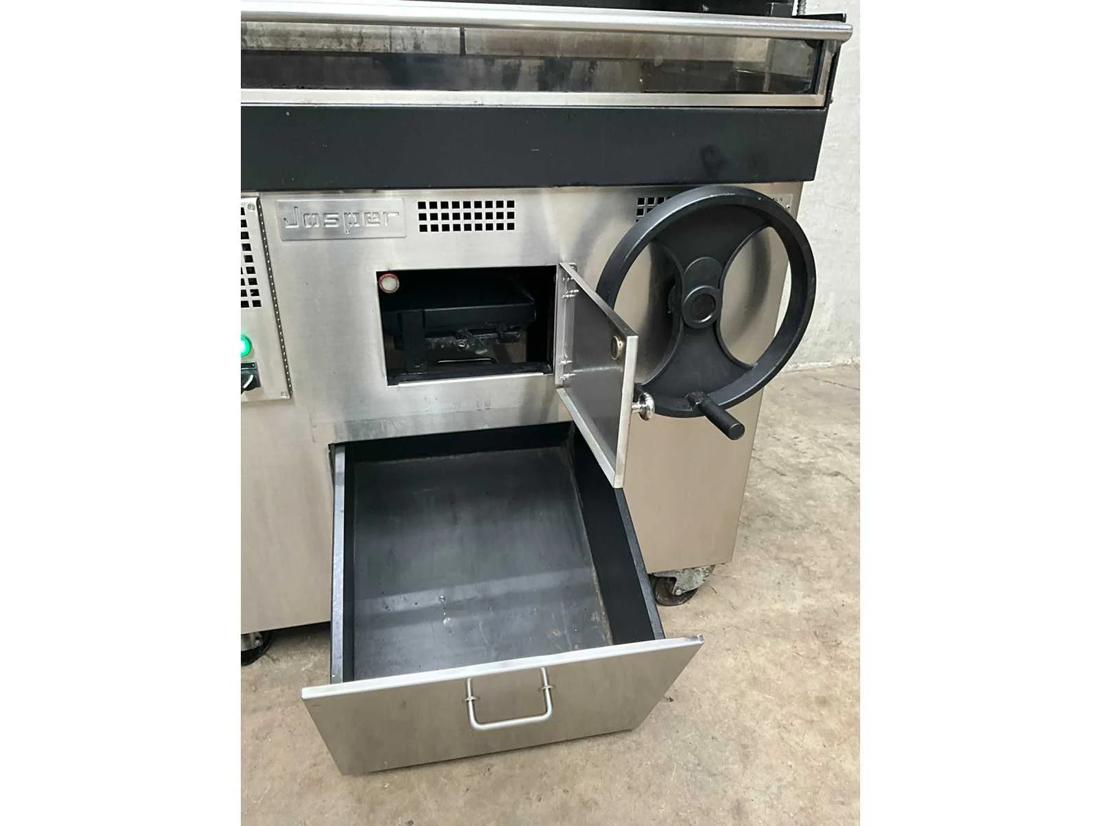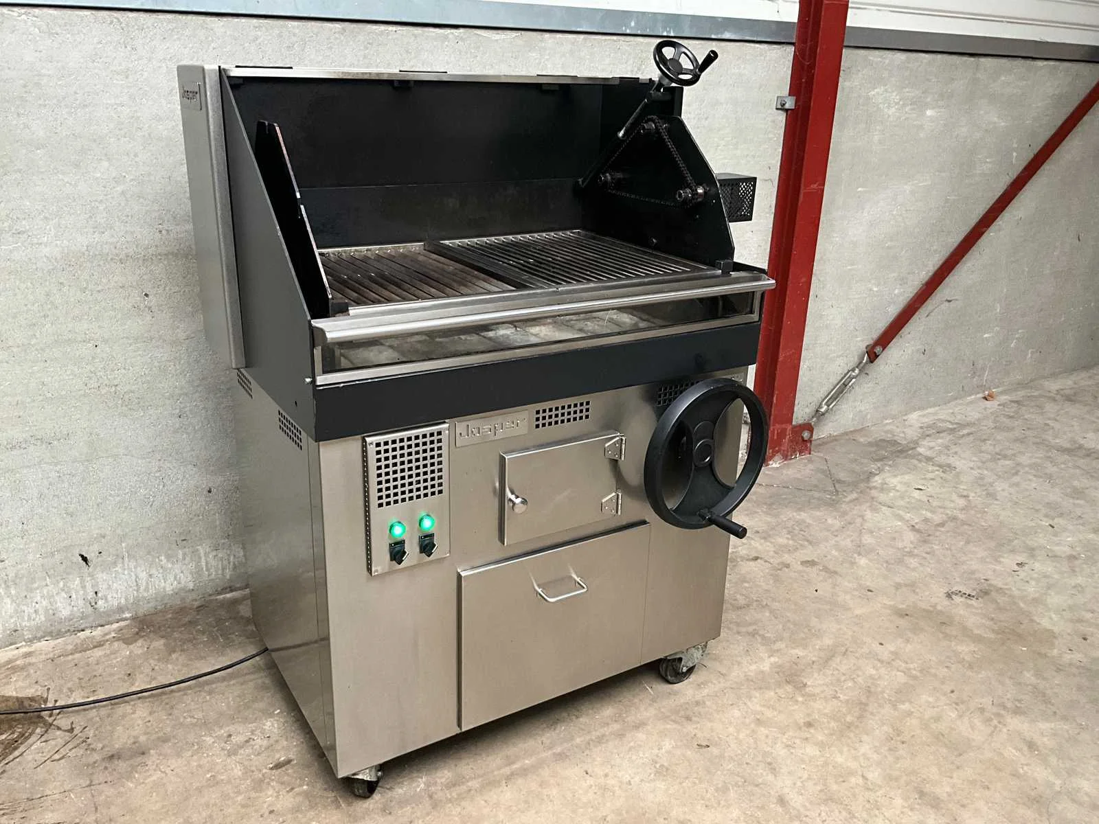 Verrijdbare houtskoolgrill, uitermate geschikt voor het bereiden van vlees op zeer hoge temperaturen waardoor het vlees snel dichtschroeit waardoor de authentieke smaak behouden blijft, grilltemperatuur 350-400 graden, voorzien van aslade Merk: Josper Type: BC1-EM Lengte: 121cm Breedte: 81cm Hoogte: 157cm
