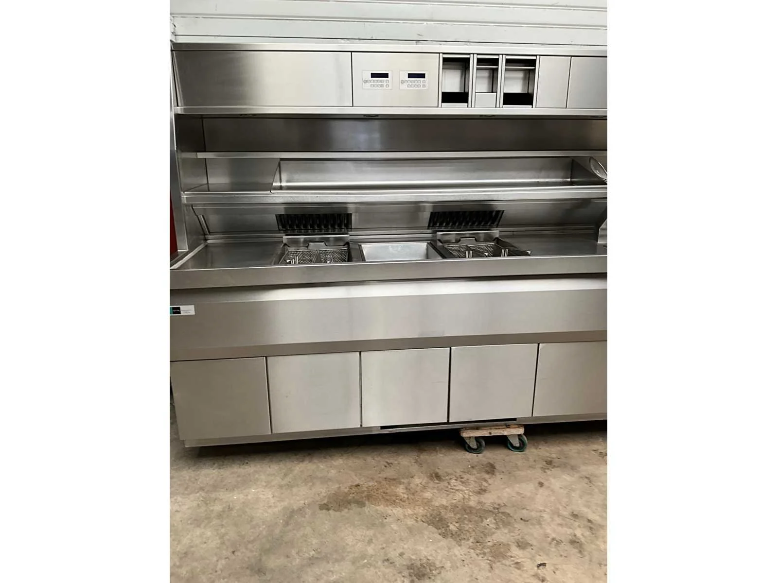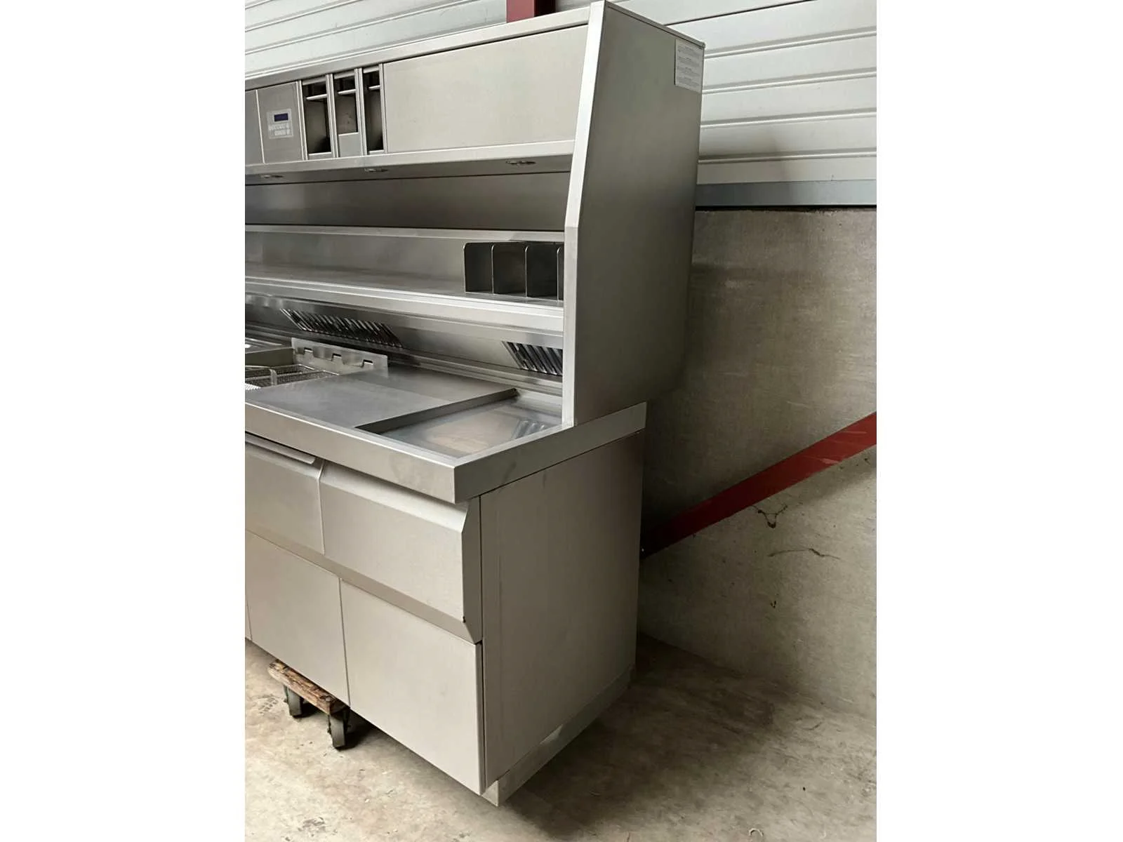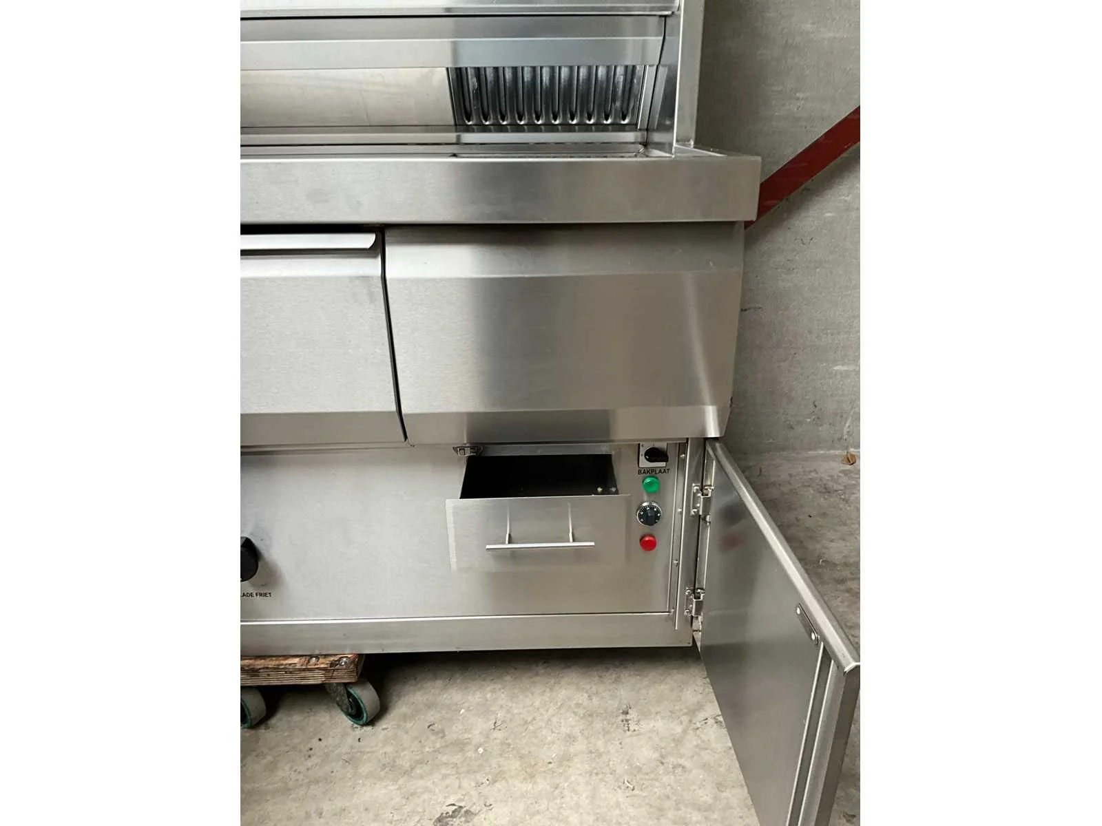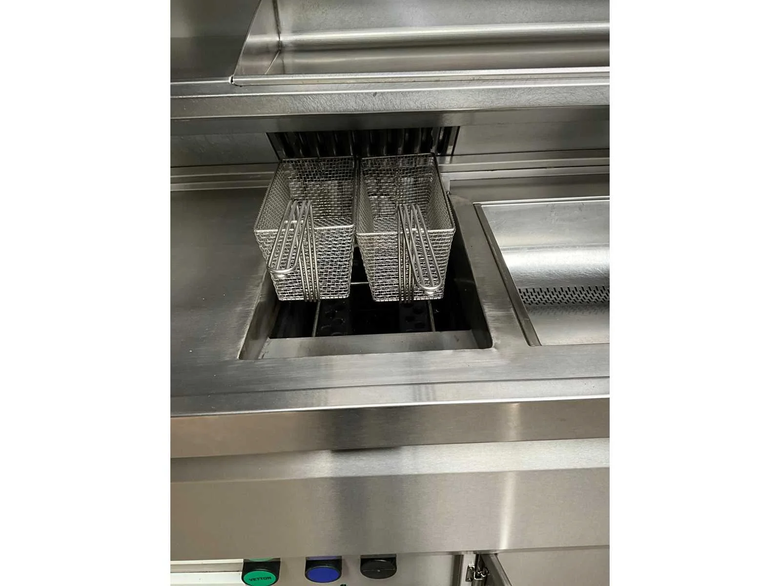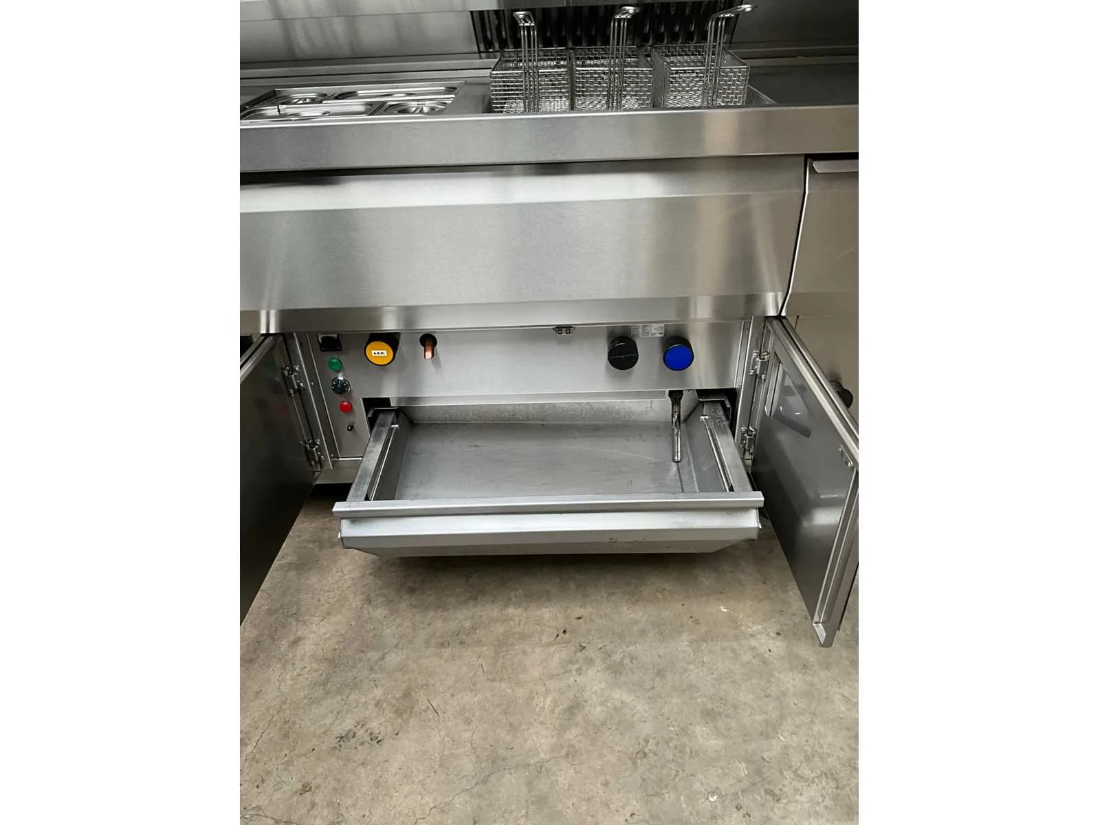 Hoogrendement frituur bakwand, 2 frituurzones met 2 manden, 1 frituurzone met 3 manden, patat schepbak, dubbele sauspomp, bain marie met diverse gn bakken, spiegelbakplaat, ingbouwde vetafvoerpomp Merk: Kiremko Aantal zones: 3 Elektrisch: true Gas: true