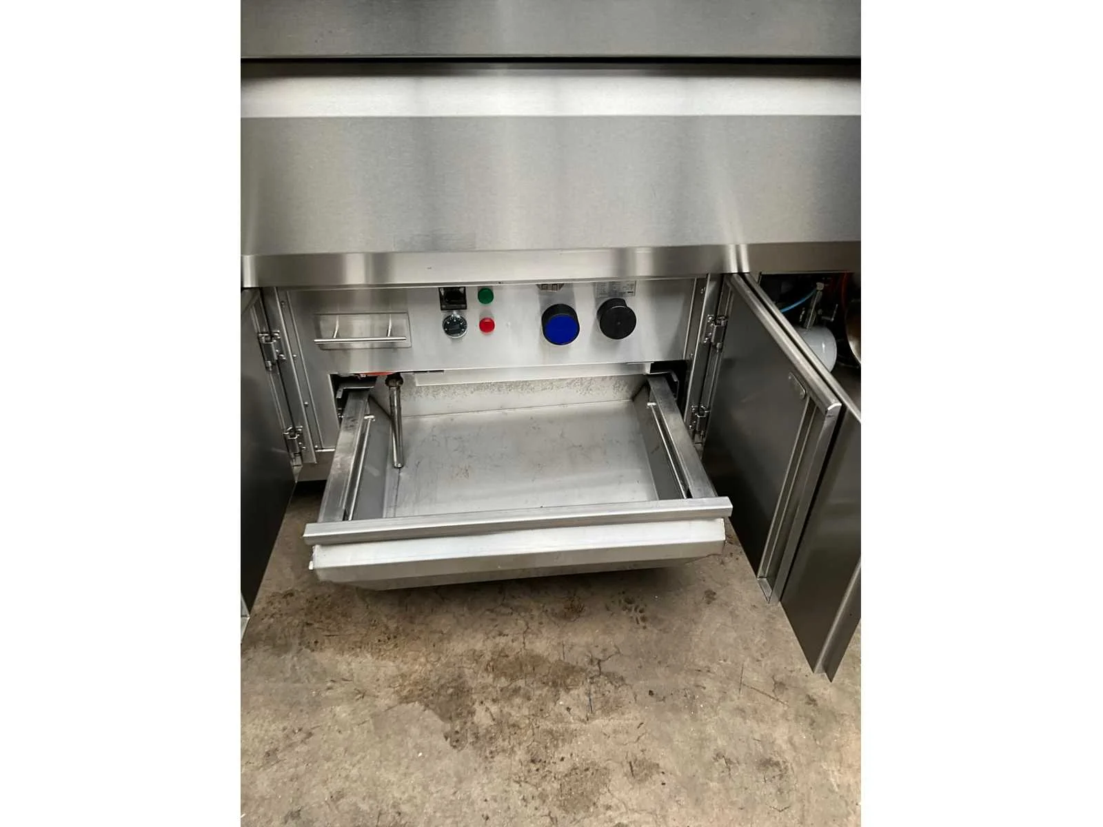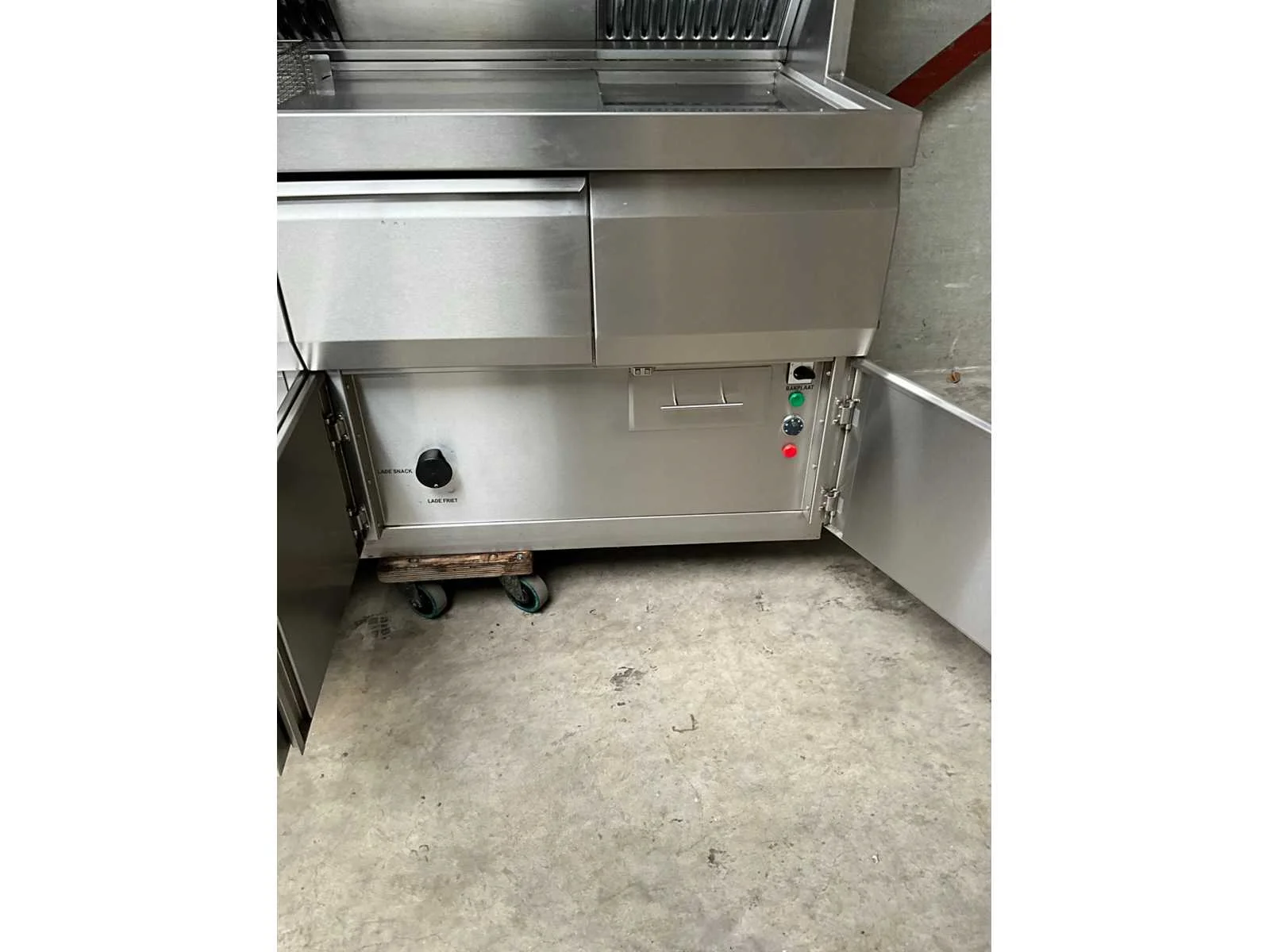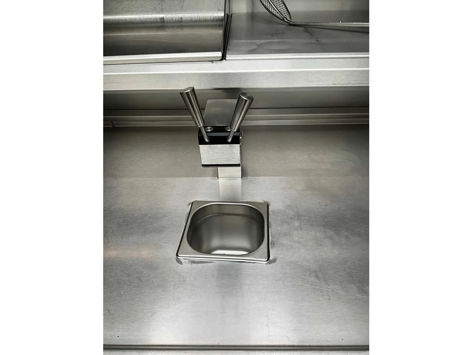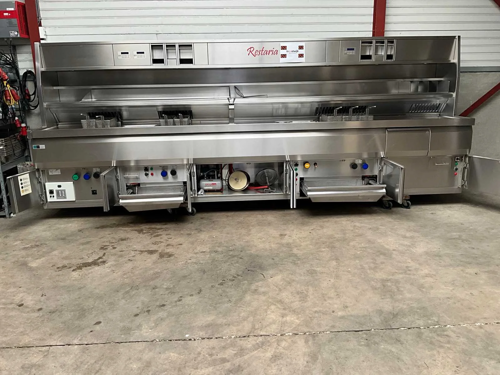Hoogrendement frituur bakwand, 2 frituurzones met 2 manden, 1 frituurzone met 3 manden, patat schepbak, dubbele sauspomp, bain marie met diverse gn bakken, spiegelbakplaat, ingbouwde vetafvoerpomp Merk: Kiremko Aantal zones: 3 Elektrisch: true Gas: true