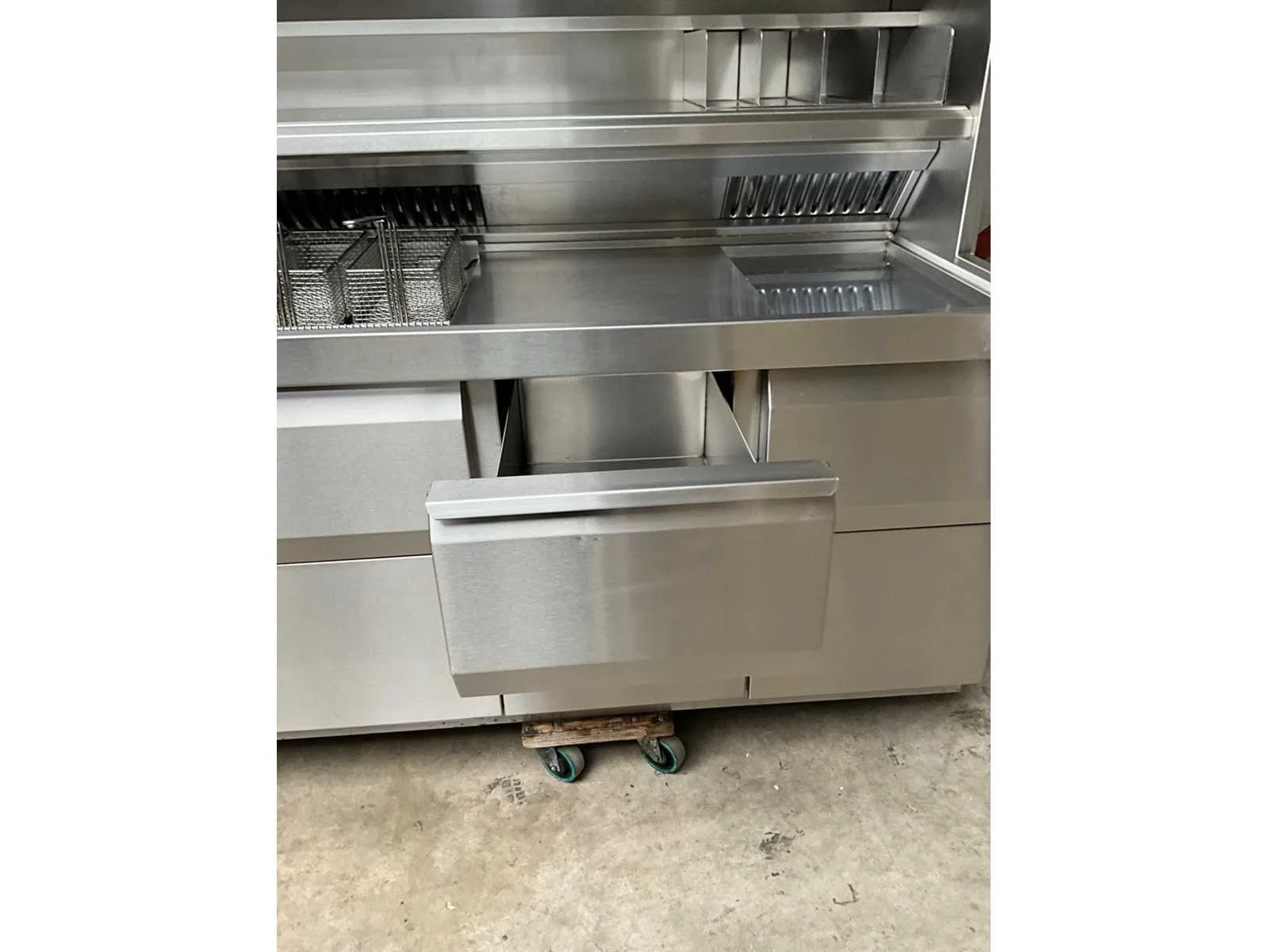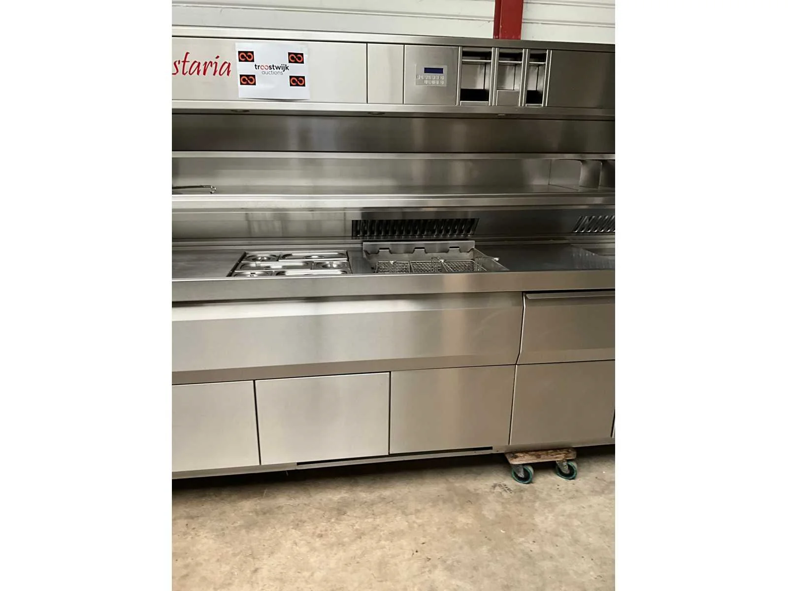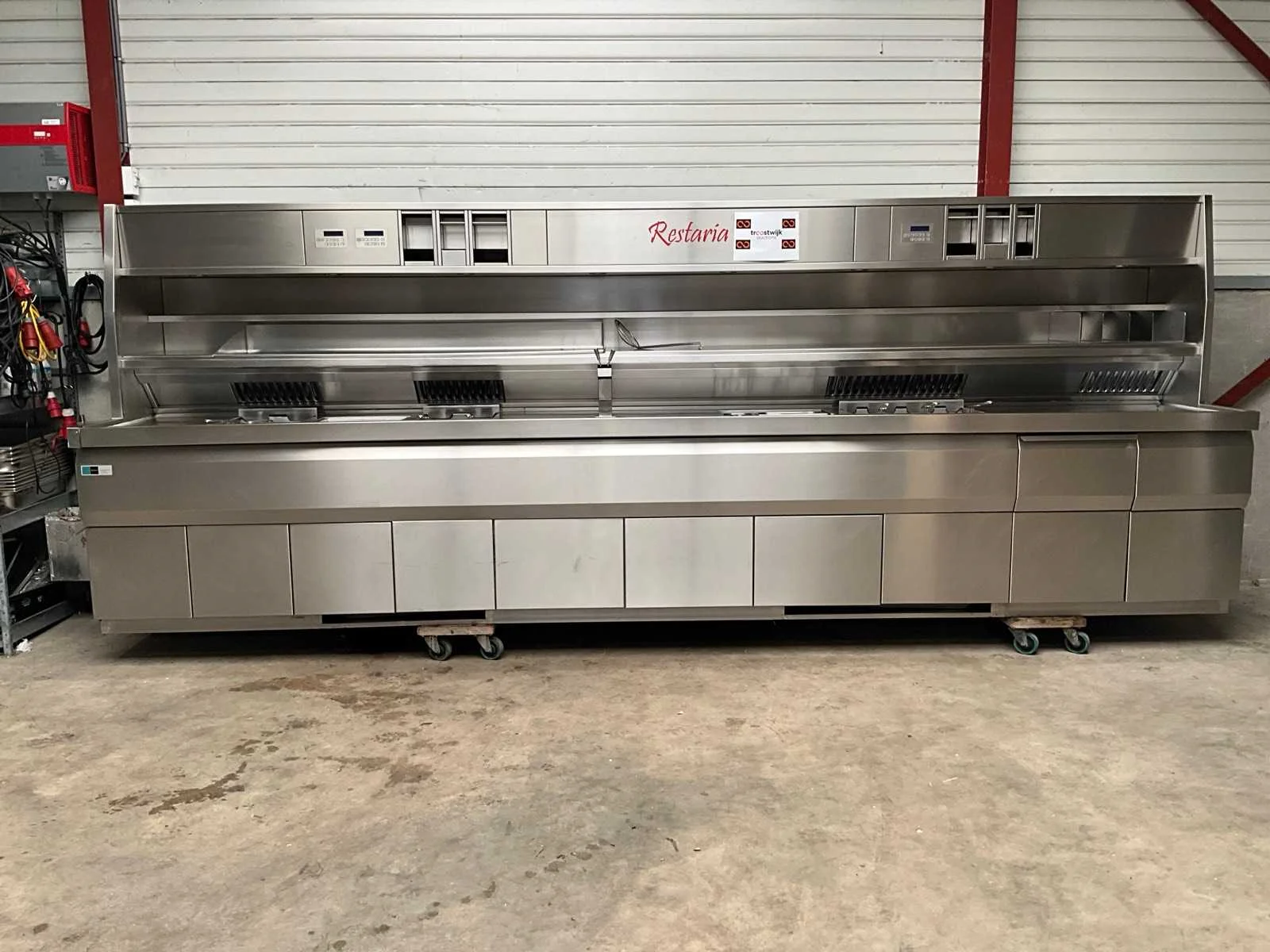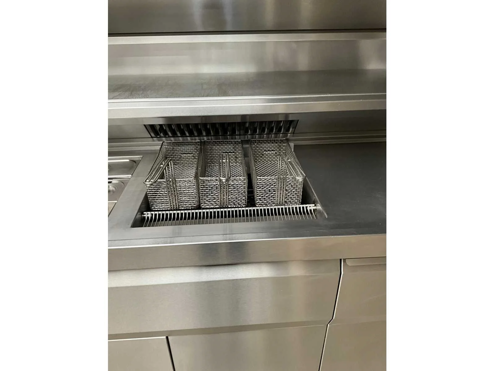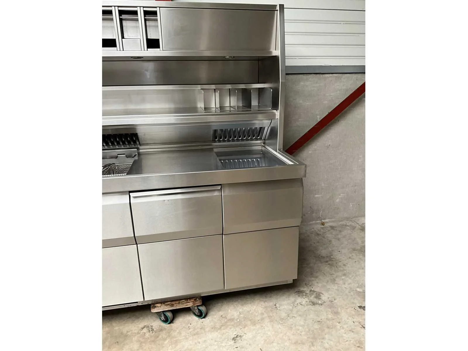 Hoogrendement frituur bakwand, 2 frituurzones met 2 manden, 1 frituurzone met 3 manden, patat schepbak, dubbele sauspomp, bain marie met diverse gn bakken, spiegelbakplaat, ingbouwde vetafvoerpomp Merk: Kiremko Aantal zones: 3 Elektrisch: true Gas: true