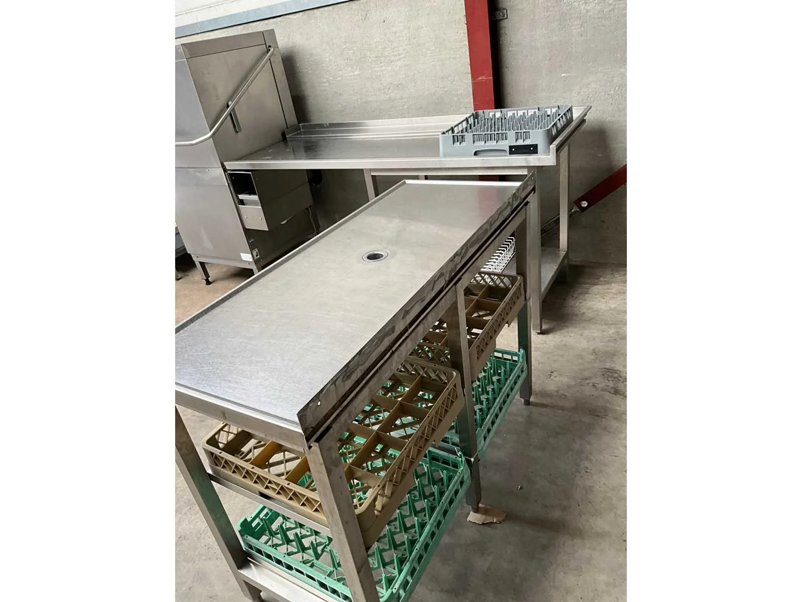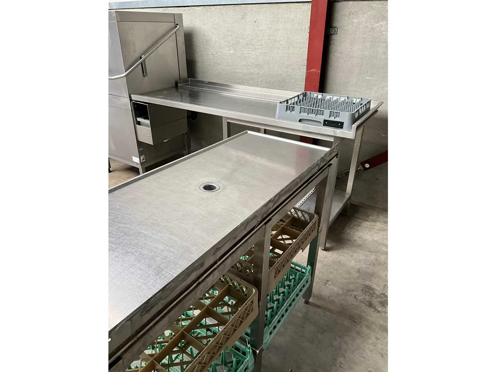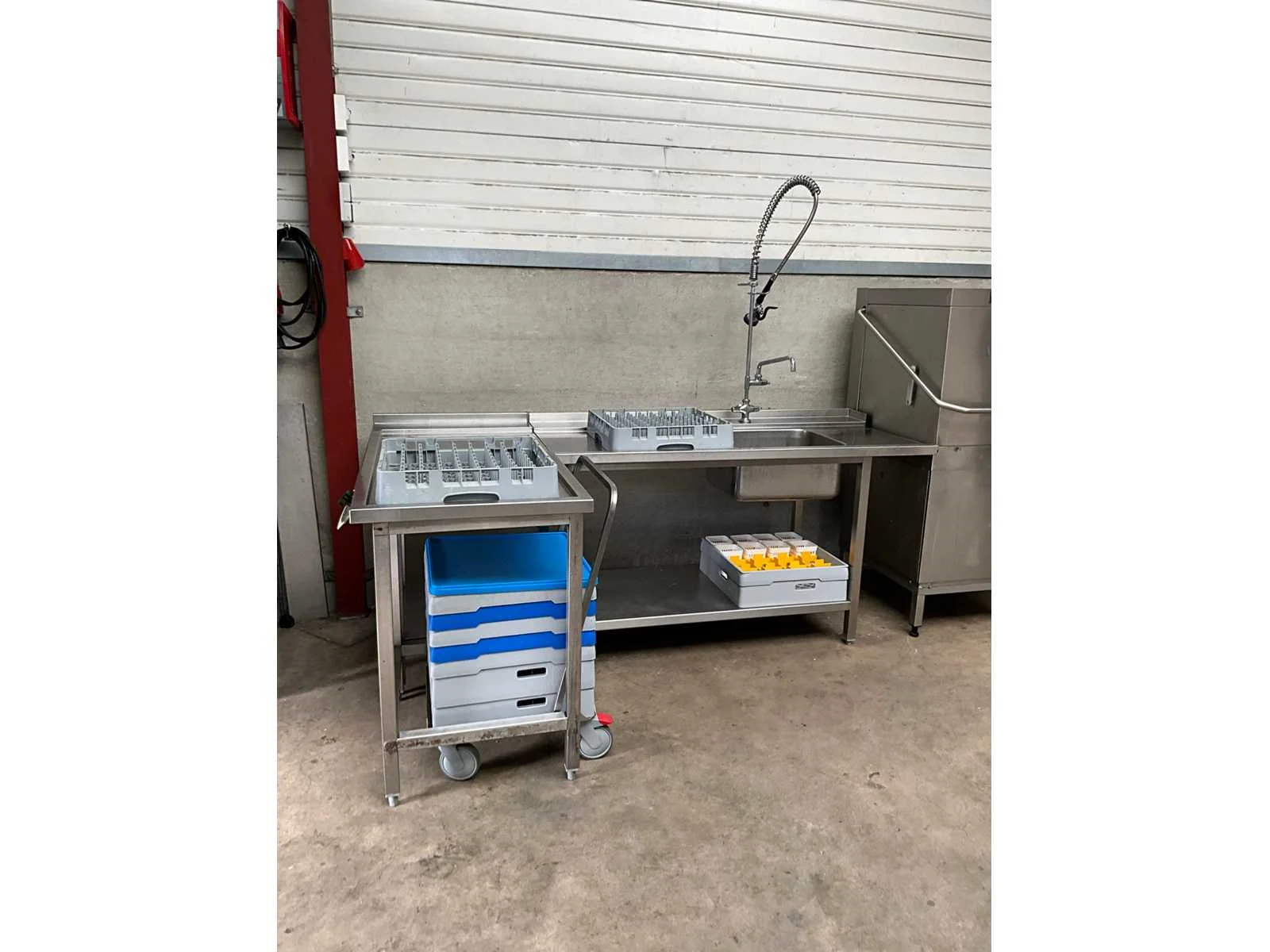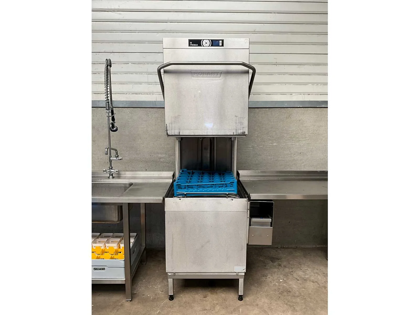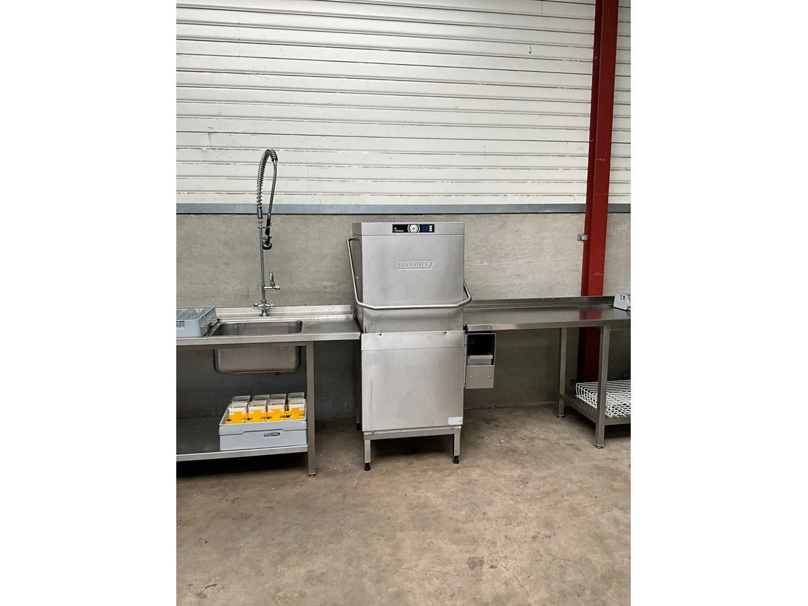 Rvs korvenvaatwasstraat, voorzien van aan en afvoertafel, spoelbak, spoelkraan, debrasseer tafel, diverse vaatwaskorven en transportkar voor korven, kan ook in hoekopstelling geplaatst worden Merk: Hobart Type: Premax Rvs: true Doorschuifmodel: true Aansluiting: 400V Korf afmeting l: 50cm Korf afmeting b: 50cm Totale afmeting Breedte: 1400mm Totale afmeting Hoogte: 1530mm Lengte: 4800