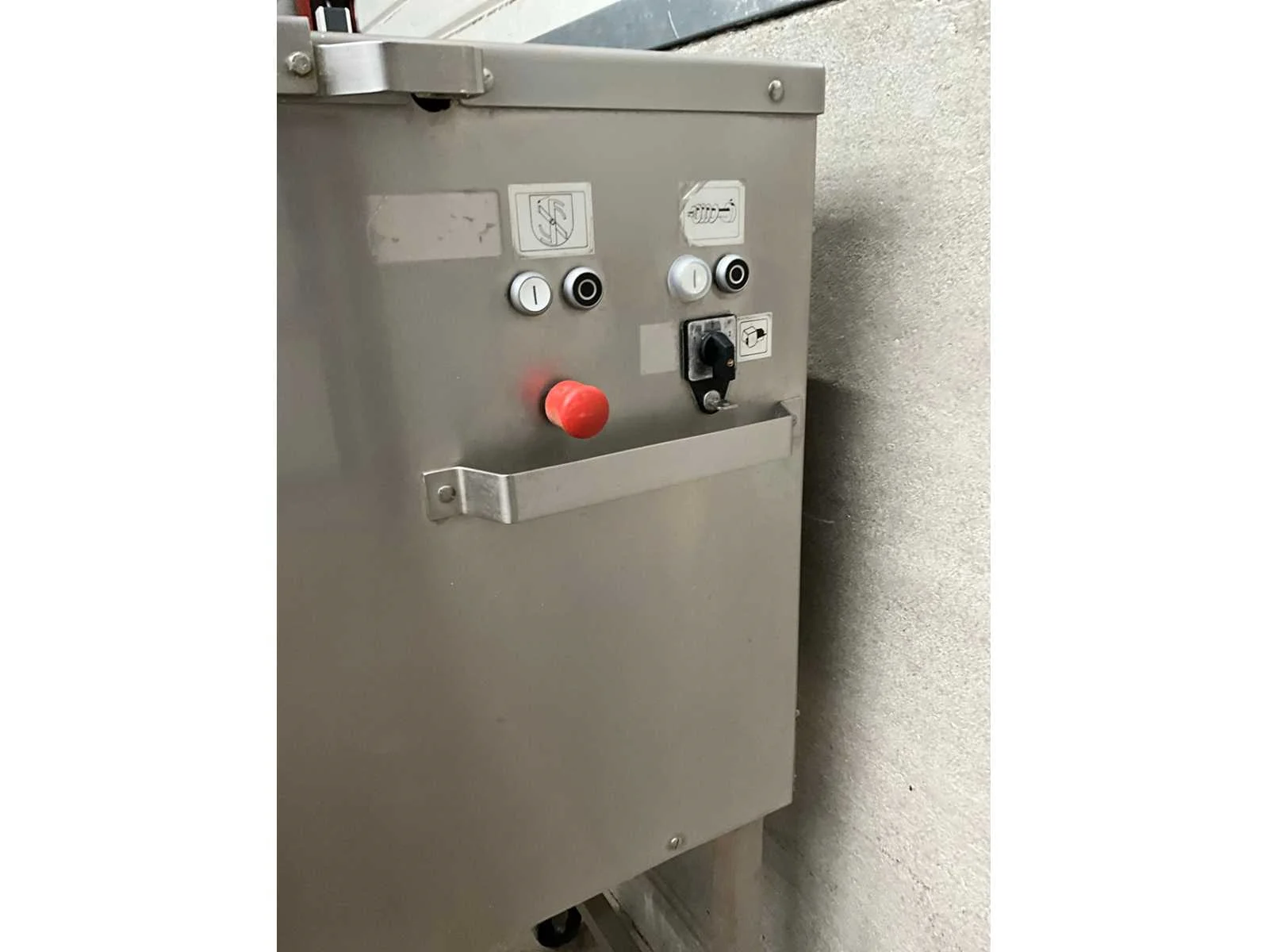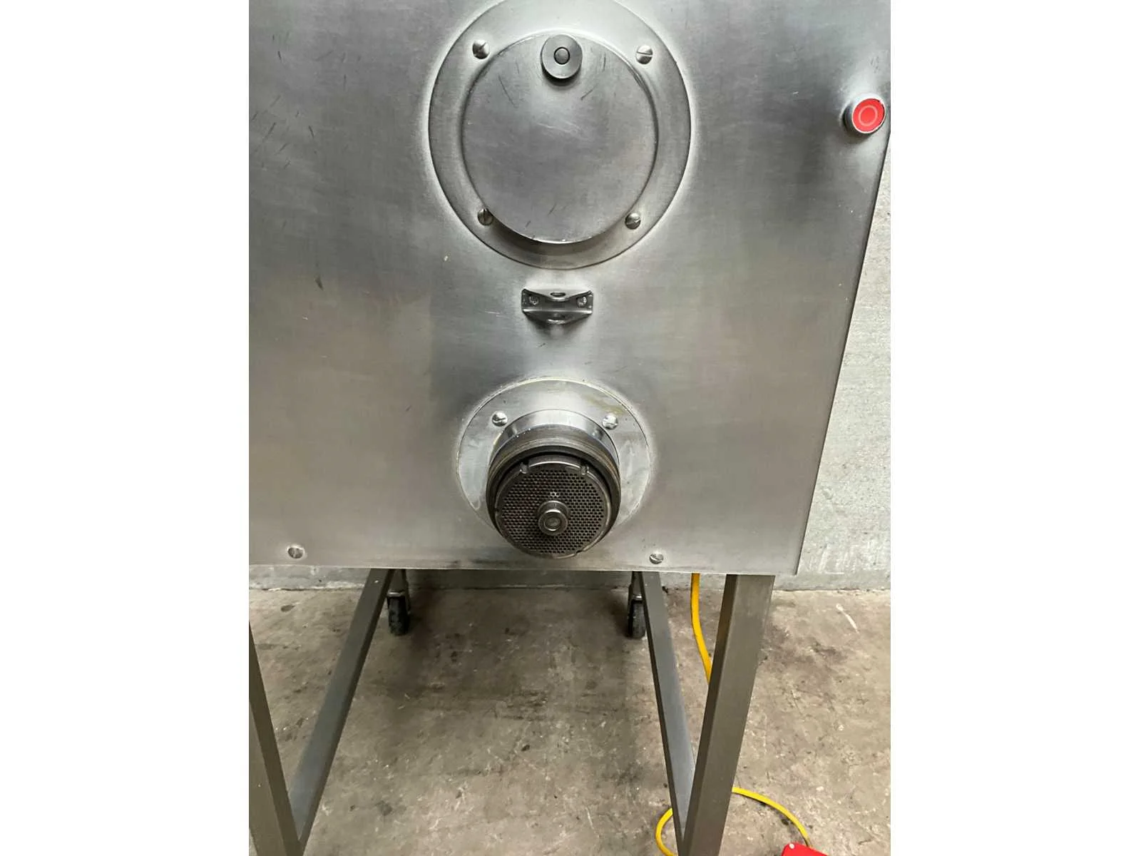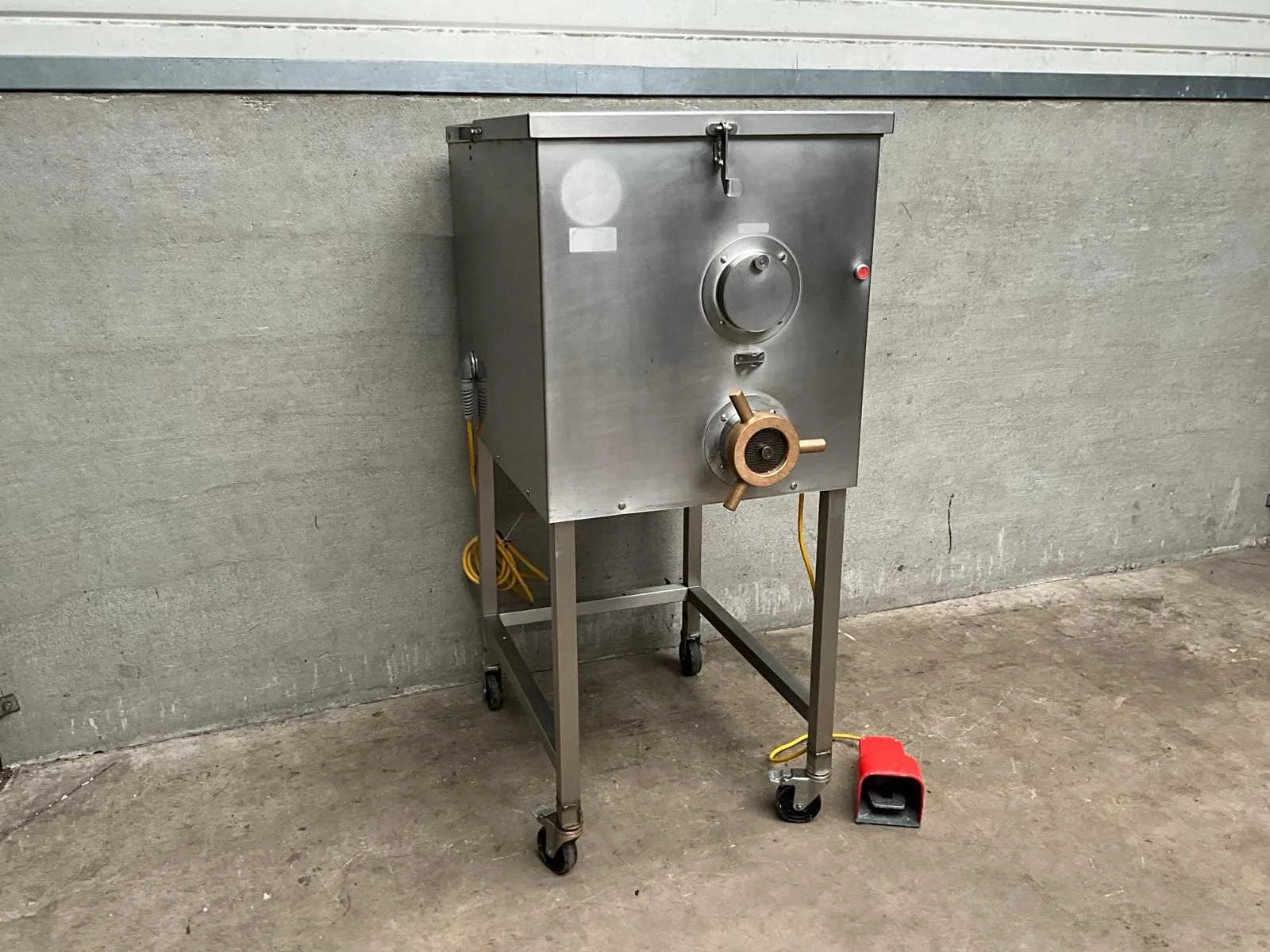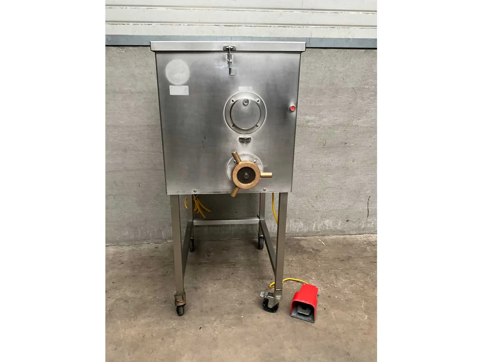 Verrijdbare vleesmolen voorzien van voetpedaal en standenregelaar Merk: Koneteollisuus Type: LM 32 A Aansluiting: 400V Totale afmeting L: 690mm Totale afmeting Breedte: 900mm Totale afmeting Hoogte: 1510mm