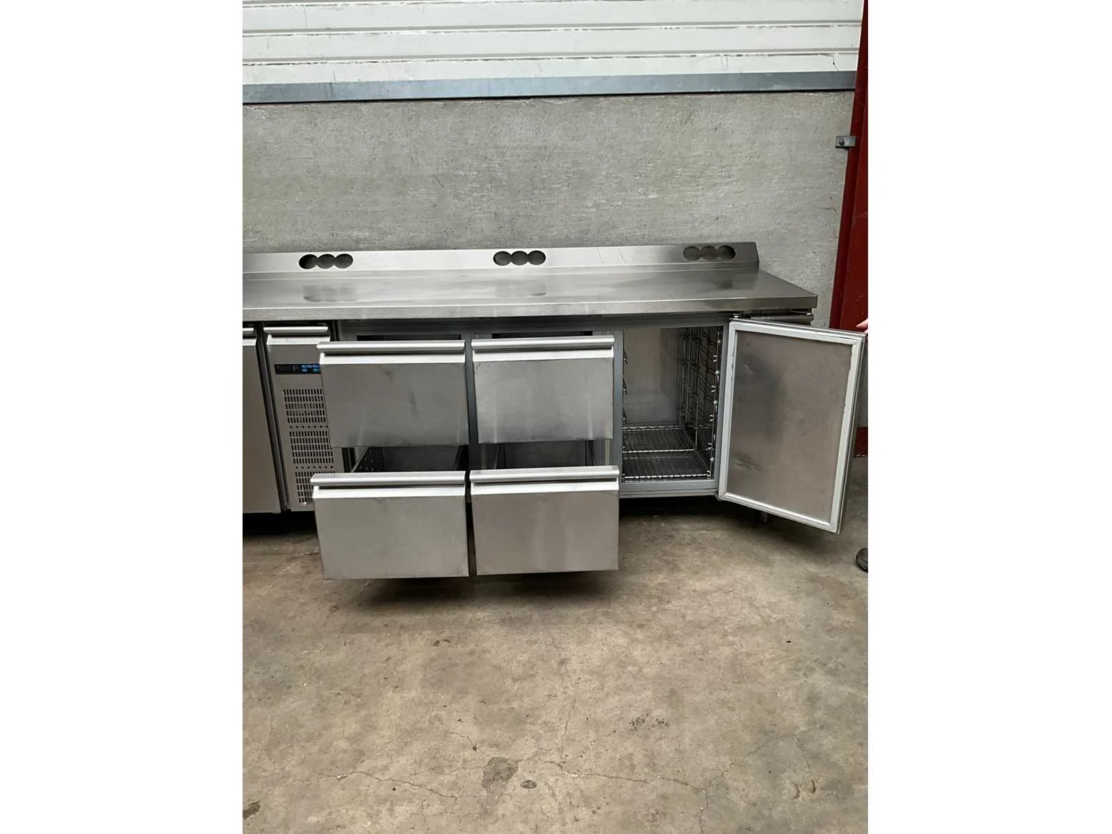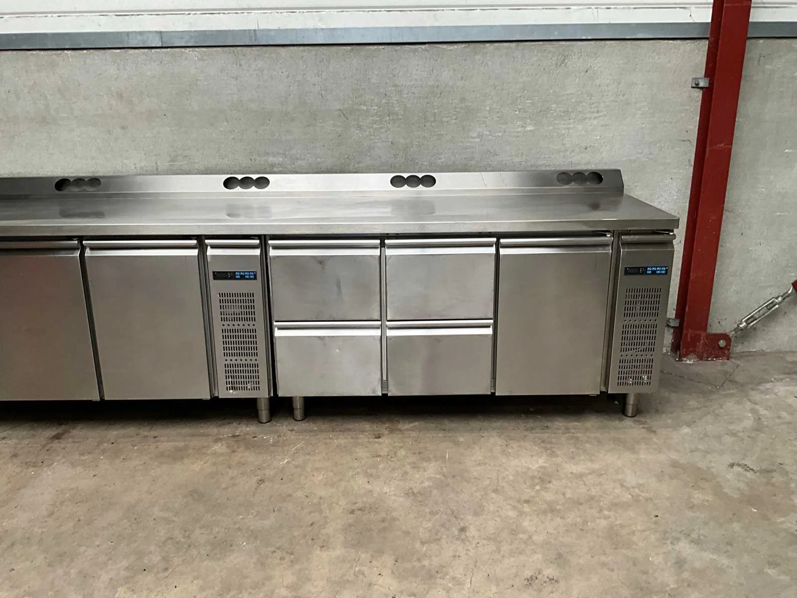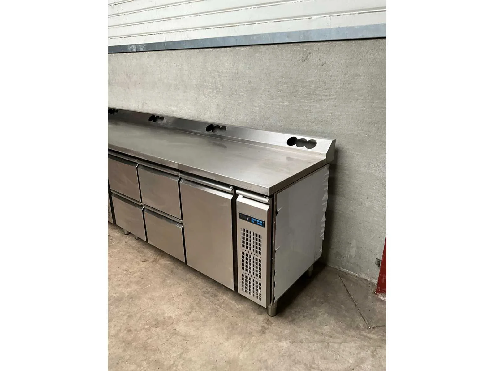 Rvs koelwerkbank voorzien van 4 laden en 4 klapdeuren, remote model, exclusief motor, werkblad voorzien van voorgeboorde gaten ter behoeve van stopcontacten Totale afmeting L: 355cm Totale afmeting Breedte: 75cm Totale afmeting Hoogte: 101cm Digitale uitlezing: true Rvs: true Aansluiting: 230V Aantal laden: 4pcs