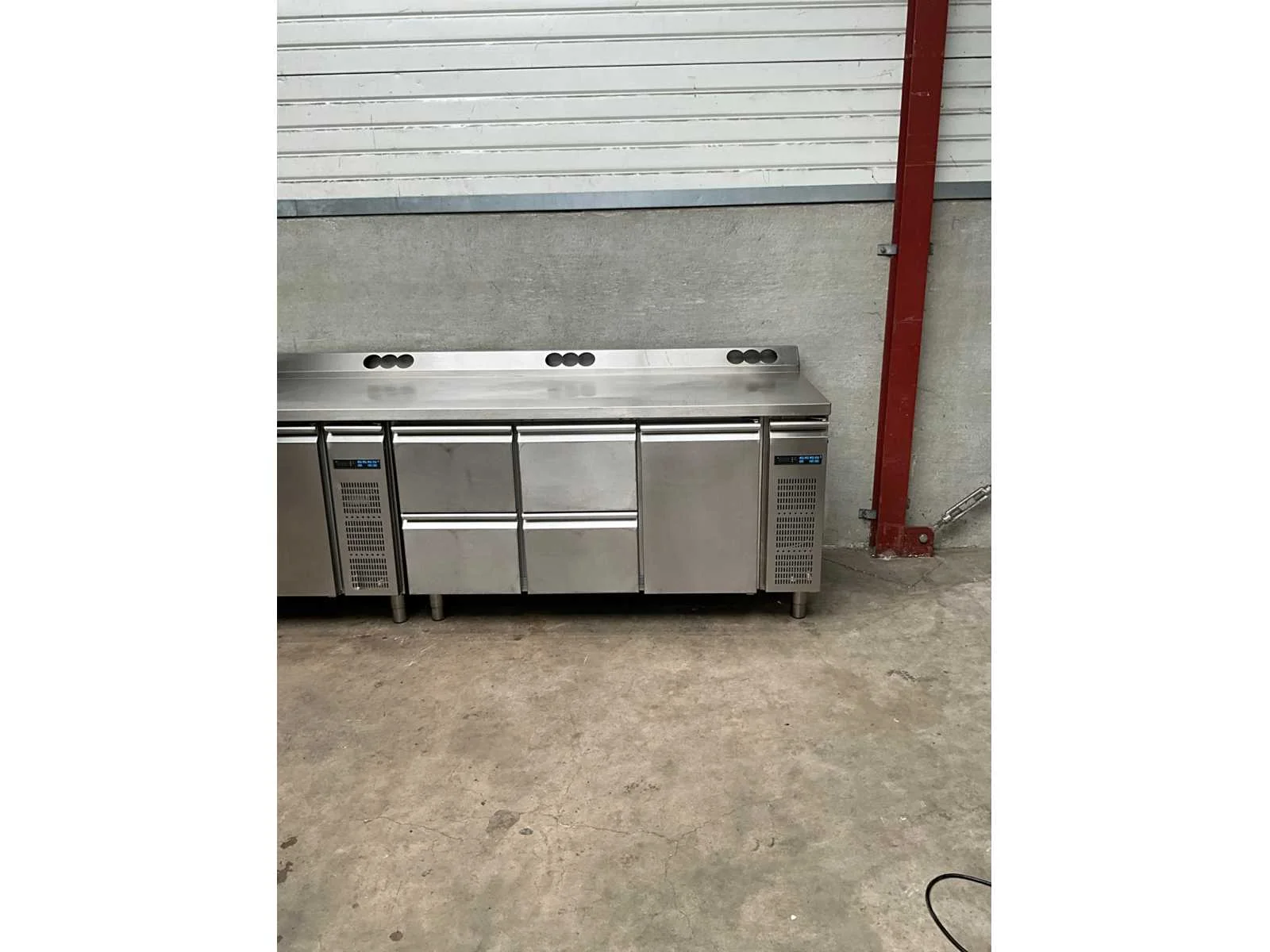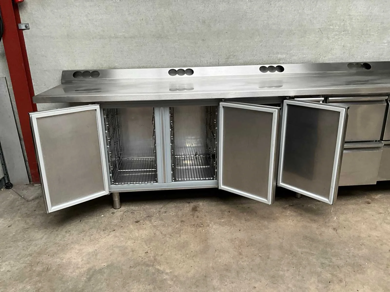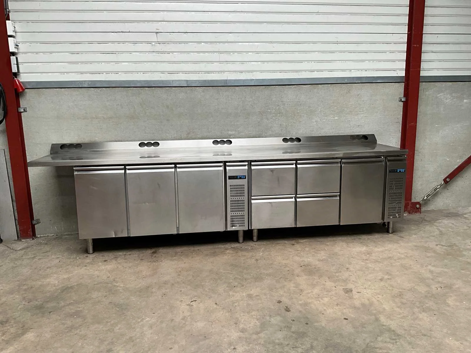 Rvs koelwerkbank voorzien van 4 laden en 4 klapdeuren, remote model, exclusief motor, werkblad voorzien van voorgeboorde gaten ter behoeve van stopcontacten Totale afmeting L: 355cm Totale afmeting Breedte: 75cm Totale afmeting Hoogte: 101cm Digitale uitlezing: true Rvs: true Aansluiting: 230V Aantal laden: 4pcs