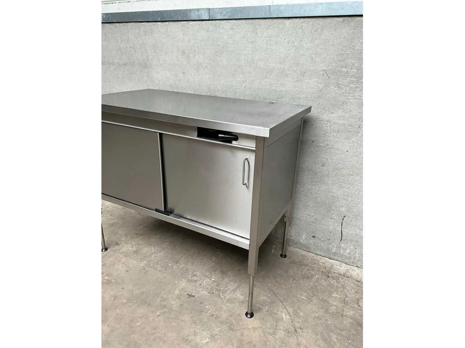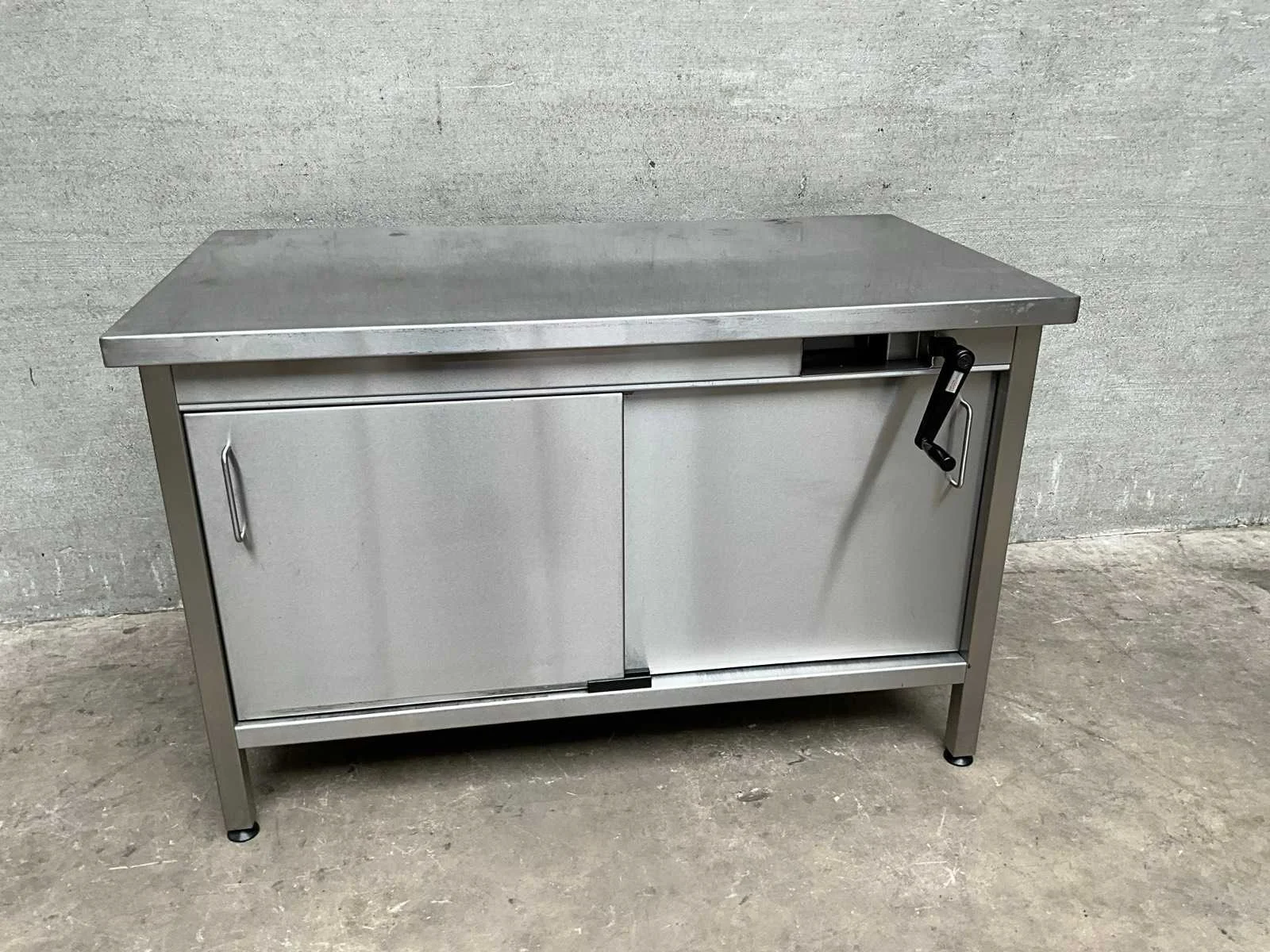 In hoogte verstelbare rvs werktafel met 2 niveaus, minimum hoogte 820 mm. maximum hoogte 1100 mm. Merk: Ergoswiss Totale afmeting L: 1290mm Totale afmeting Breedte: 700mm Totale afmeting Hoogte: 820mm
