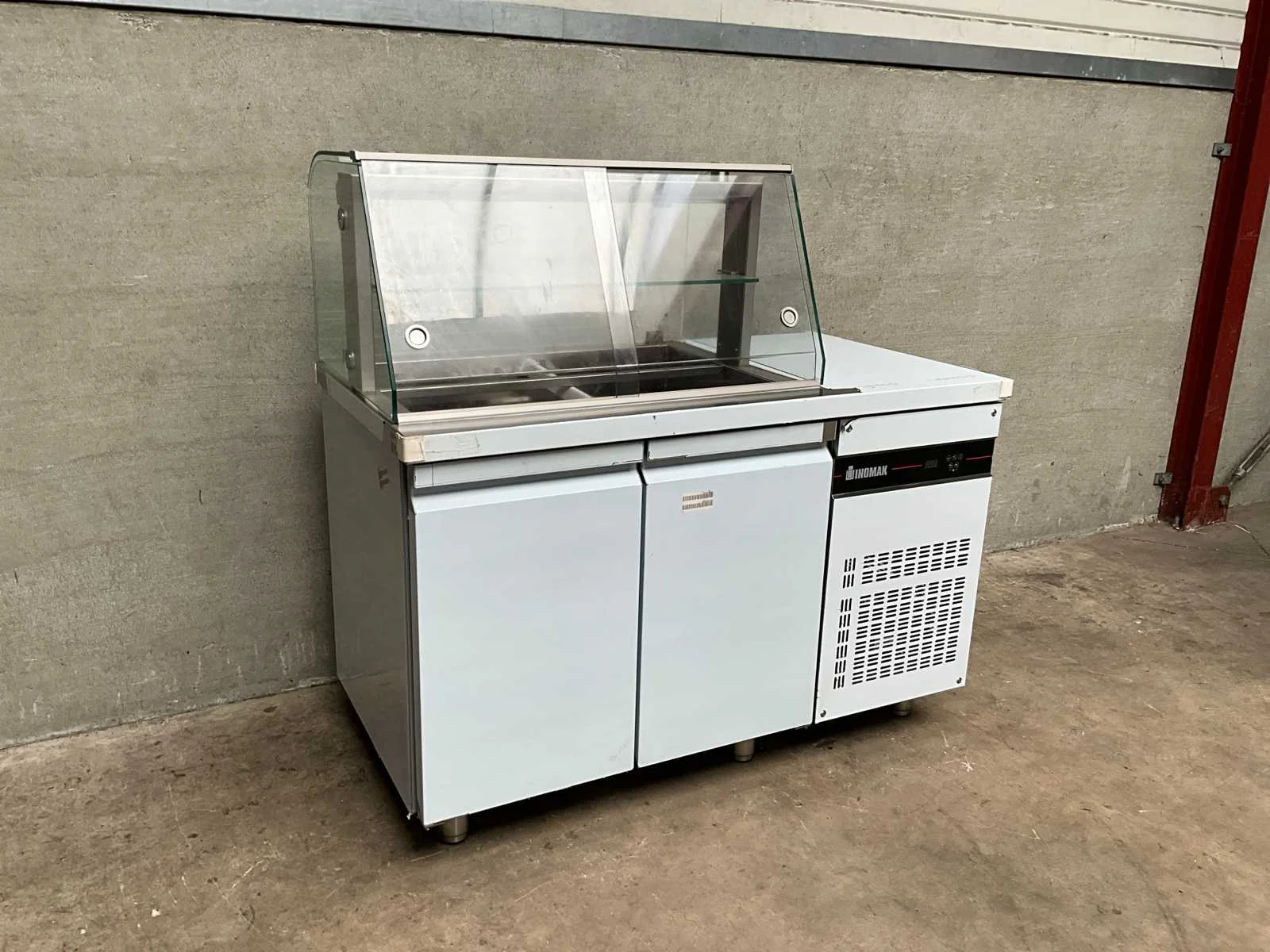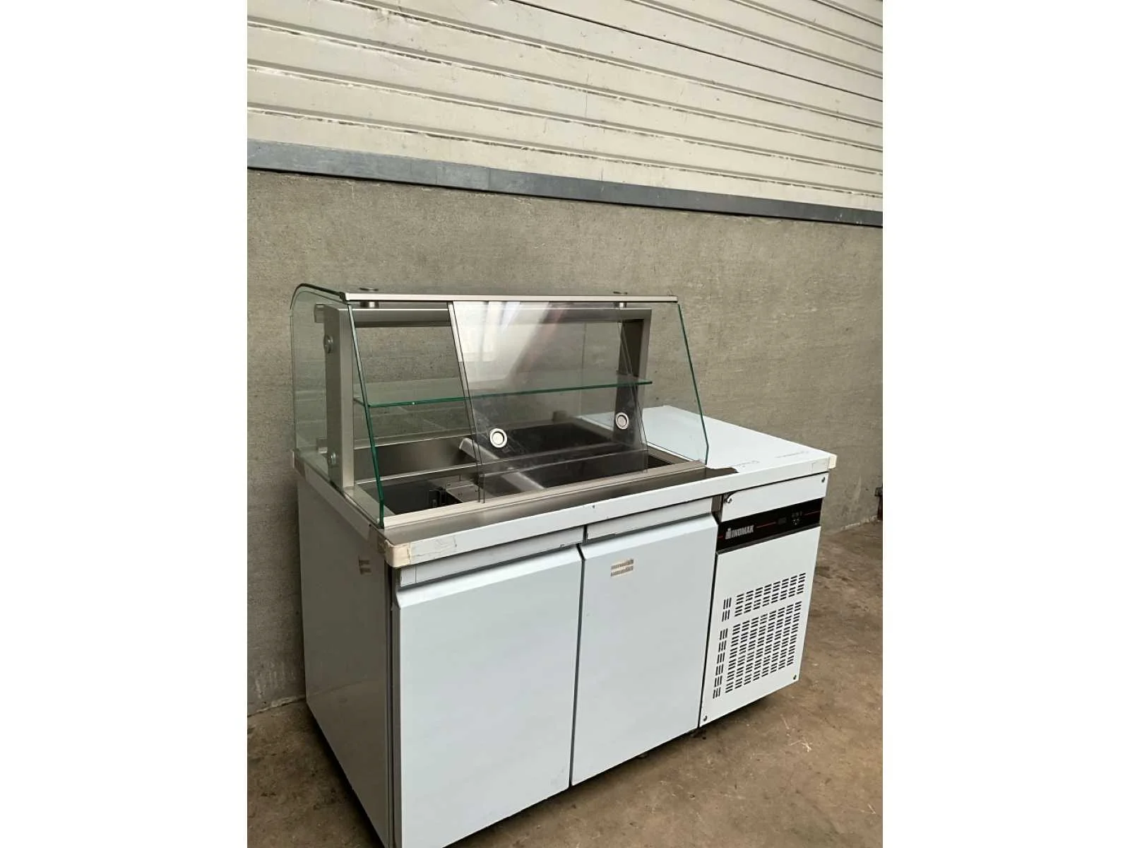 Rvs saldette, geschikt voor gastronorm bakken, met glasopbouw voorzien van 2 kunststof schuifdeuren, 2 klapdeuren met in hoogte verstelbare roosters, ongebruikt Merk: Inomak Type: ZQRP99 Ingebouwde koelcompressor: true Digitale uitlezing: true Rvs: true Aansluiting: 230V Totale afmeting L: 1360cm Totale afmeting Breedte: 700cm Totale afmeting Hoogte: 1310cm