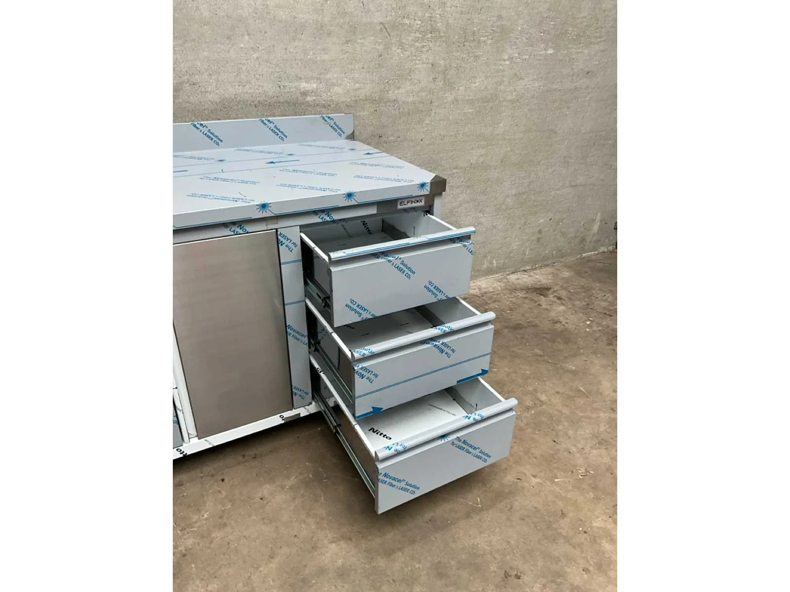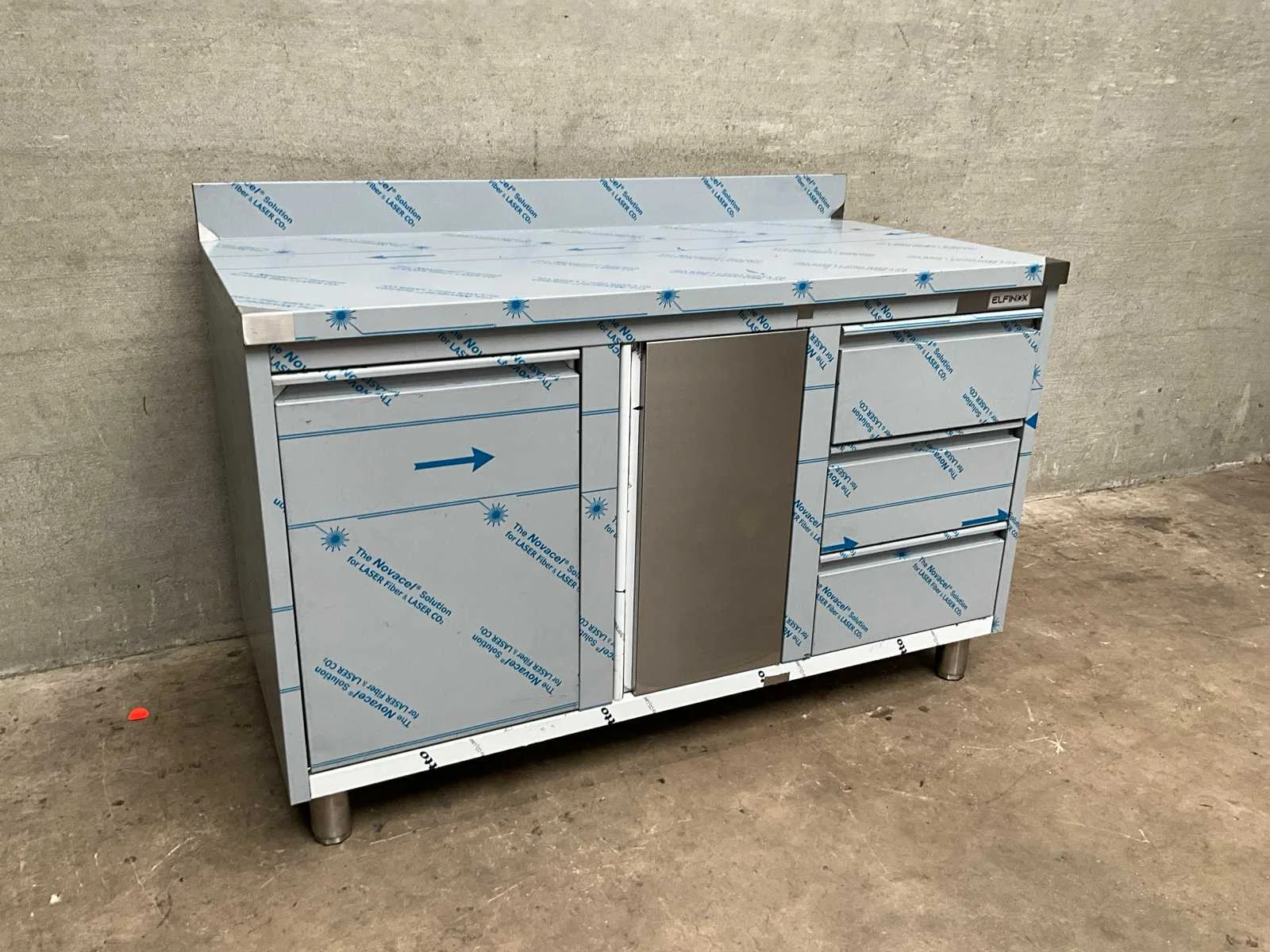 Rvs werktafel met opstaande rand, voorzien van 1 klapdeur, 3 lades en 1 kantelbare deur t.b.v. afvalbak Merk: Elfinox Totale afmeting L: 1400mm Totale afmeting Breedte: 700mm Totale afmeting Hoogte: 879mm