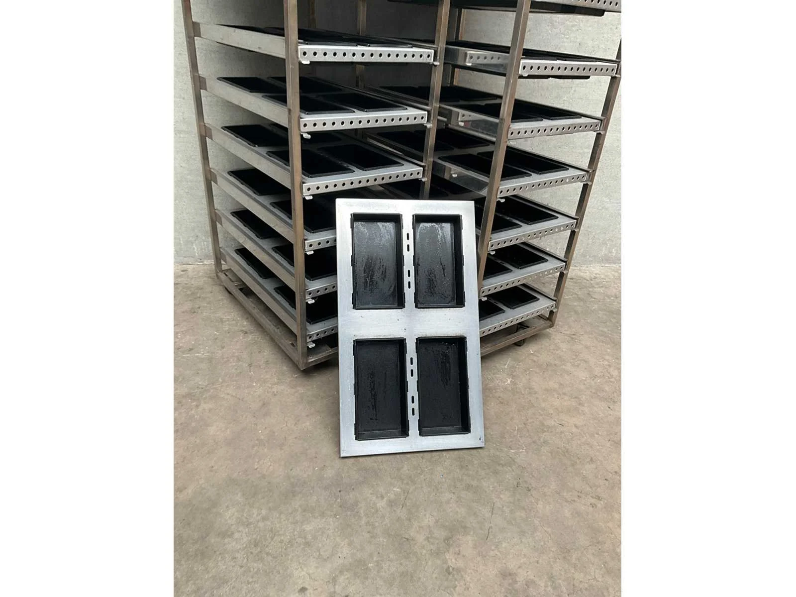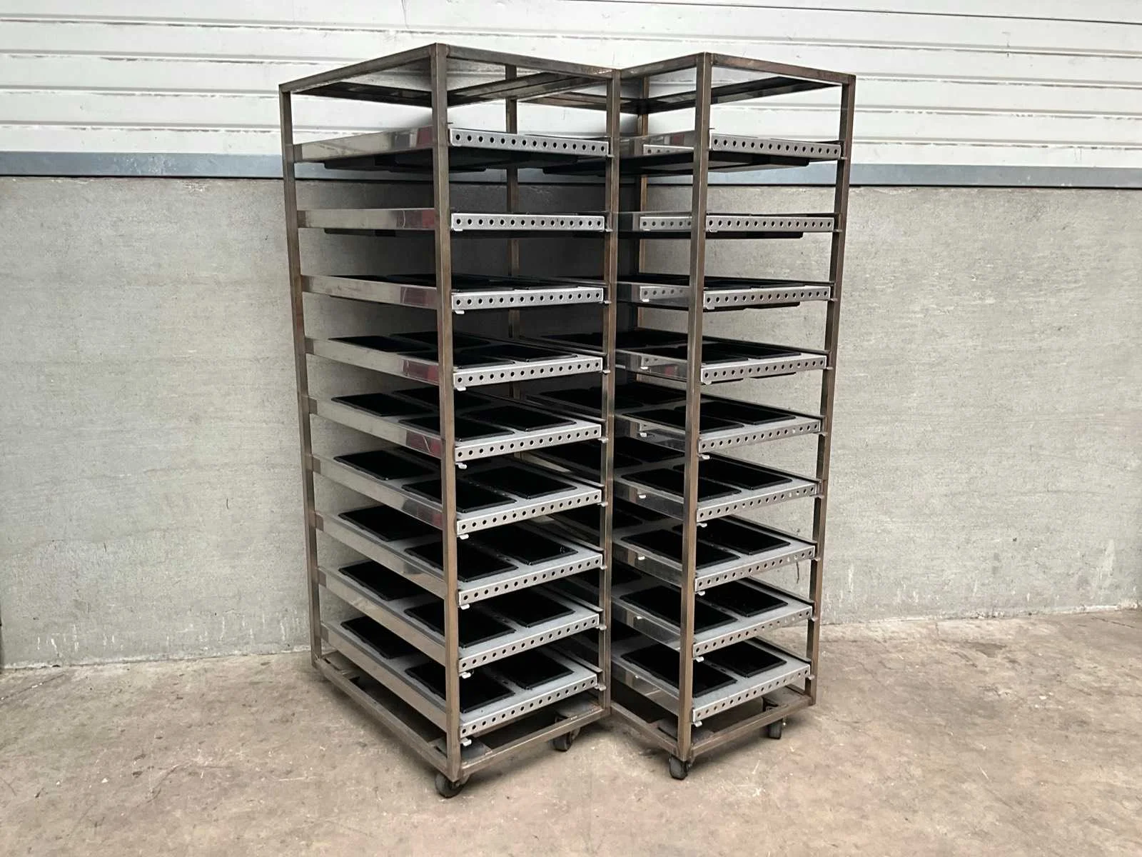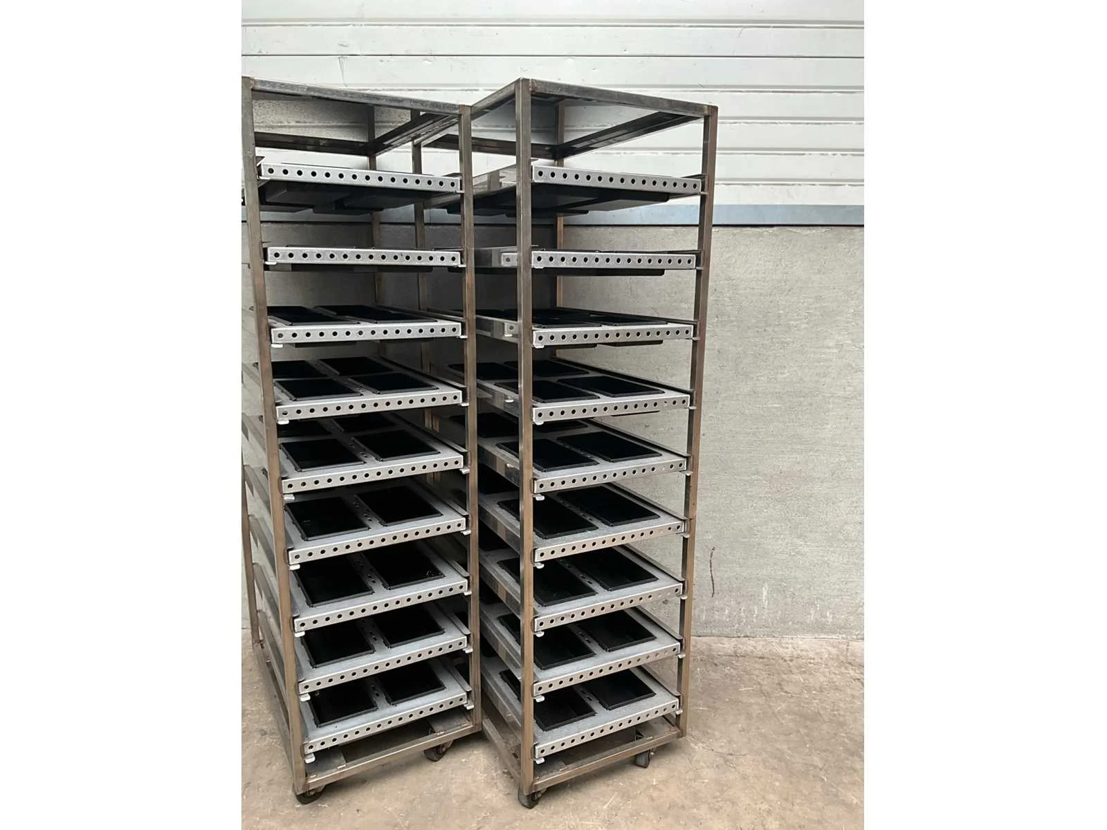 Verrijdbare rvs kar, geschikt voor platen van 46x80 cm. met daarin 4 bakvormen ten behoeve van vloerbrood. Formaat van de vorm is 15x30x6 cm. Merk: KeyBake Totale afmeting L: 530mm Totale afmeting Breedte: 840mm Totale afmeting Hoogte: 1820mm