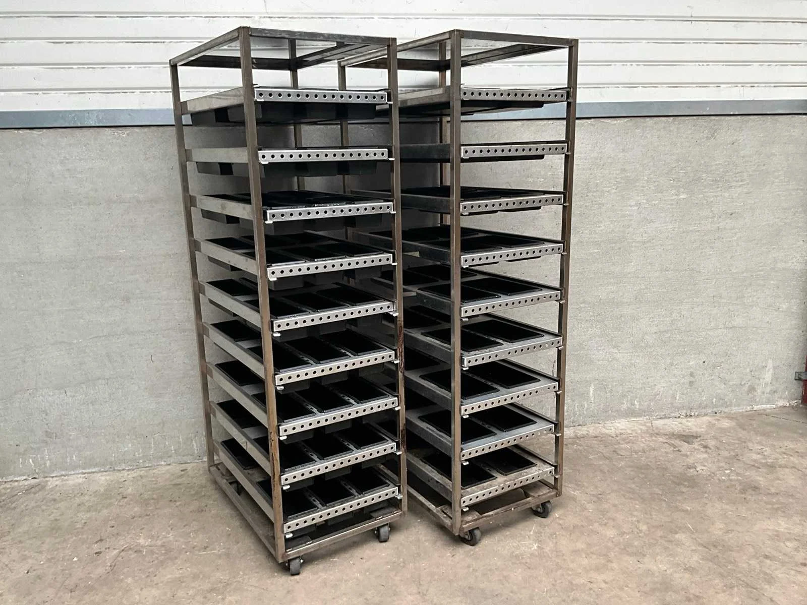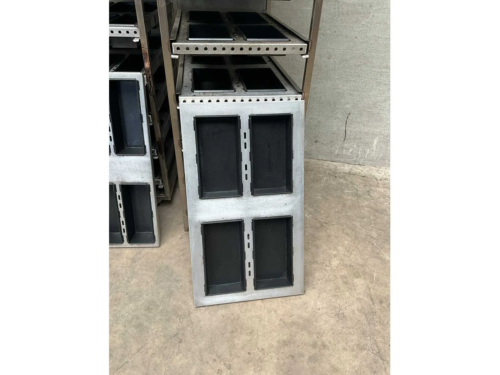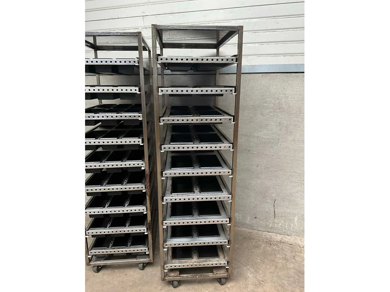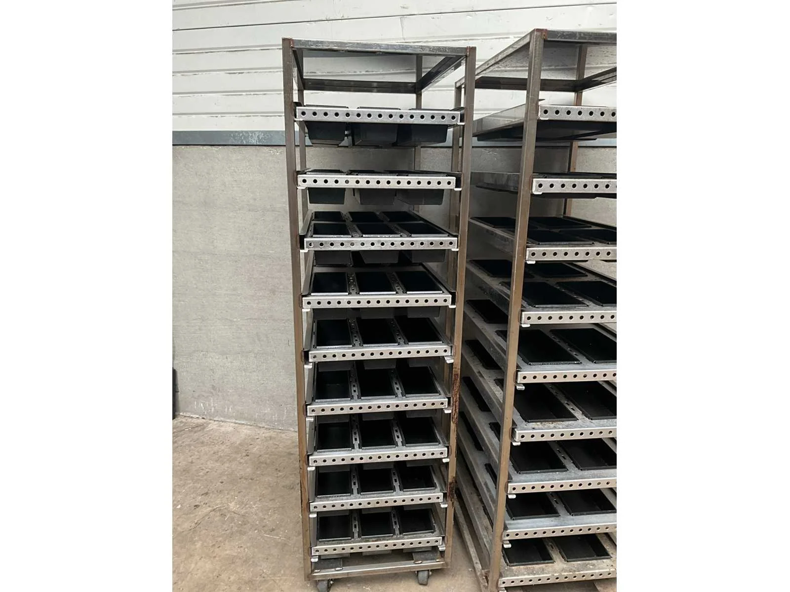 Verrijdbare rvs kar, geschikt voor platen van 46x80 cm. met in 1 kar 6 bakvormen ten behoeve van busbrood. Formaat van de vorm is 11x30x9 cm. En in 1 kar 4 bakvormen ten behoeve van vloerbrood. Formaat van de vorm is 15x30x6 cm. Merk: KeyBake Totale afmeting L: 530mm Totale afmeting Breedte: 840mm Totale afmeting Hoogte: 1820mm
