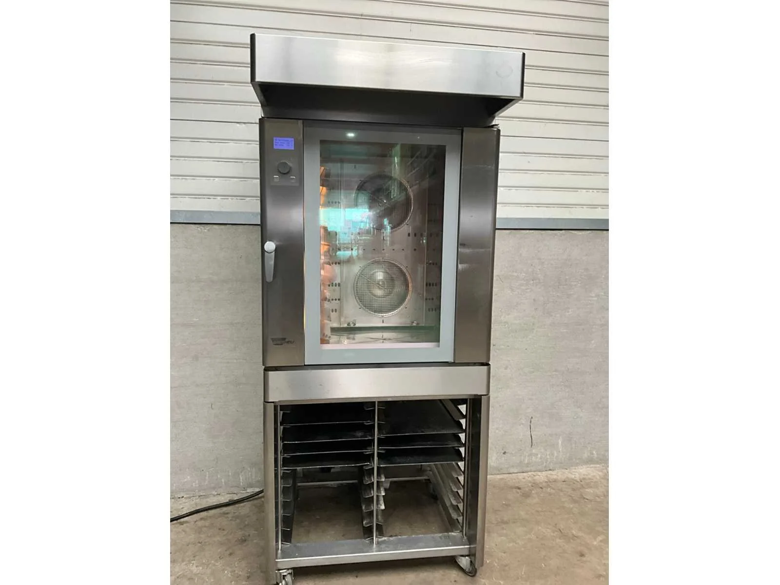 Heteluchtoven met 10 regalen op verrijdbaar onderstel met 20 regalen, voorzien van afzuigkap Merk: Wiesheu Type: B8E2IS500 Aansluiting: 400V Elektrisch: true Rvs: true Totale afmeting L: 100cm Totale afmeting Breedte: 113cm Totale afmeting Hoogte: 224cm
