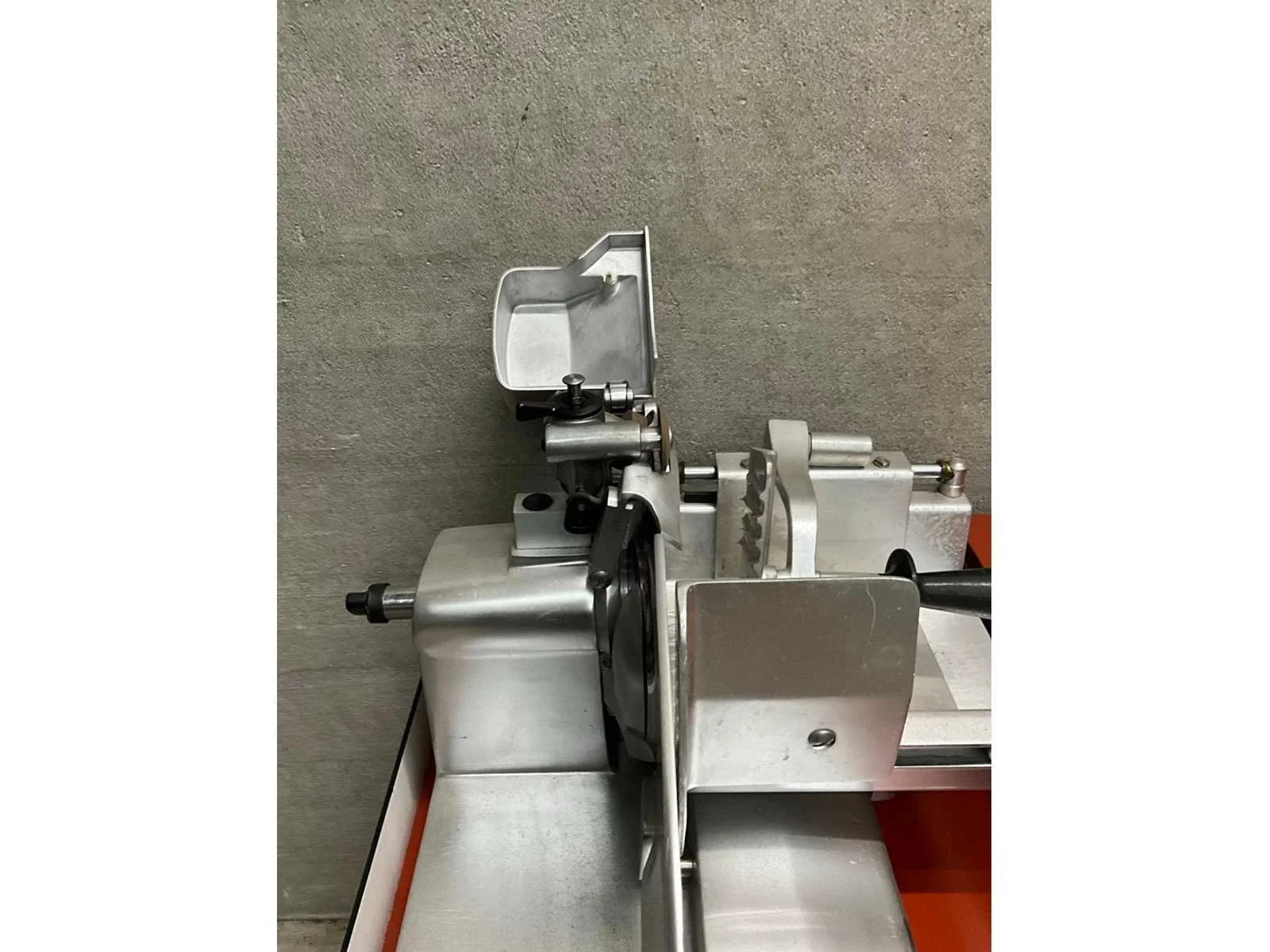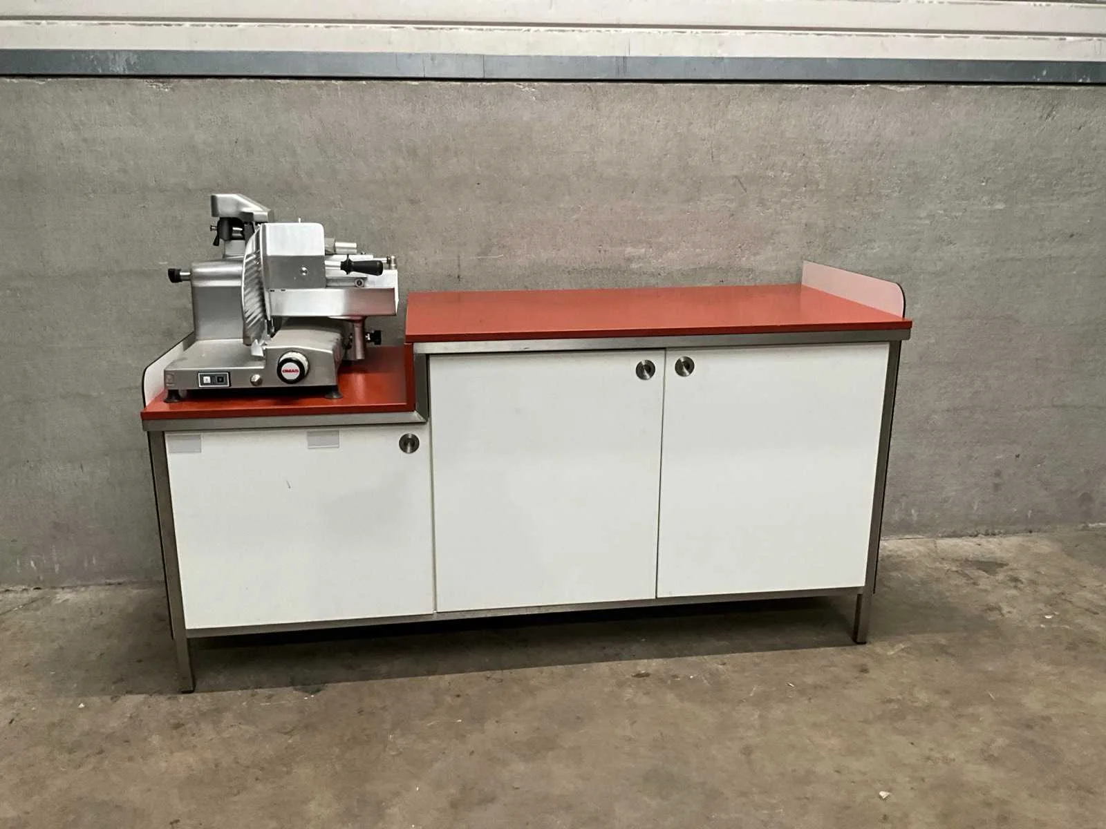 Werktafel voorzien van kunststofblad en een Omas snijmachine Merk: Omas Messlijper: true Aansluiting: 230V Totale afmeting L: 700mm Totale afmeting Breedte: 1900mm Totale afmeting Hoogte: 1260mm