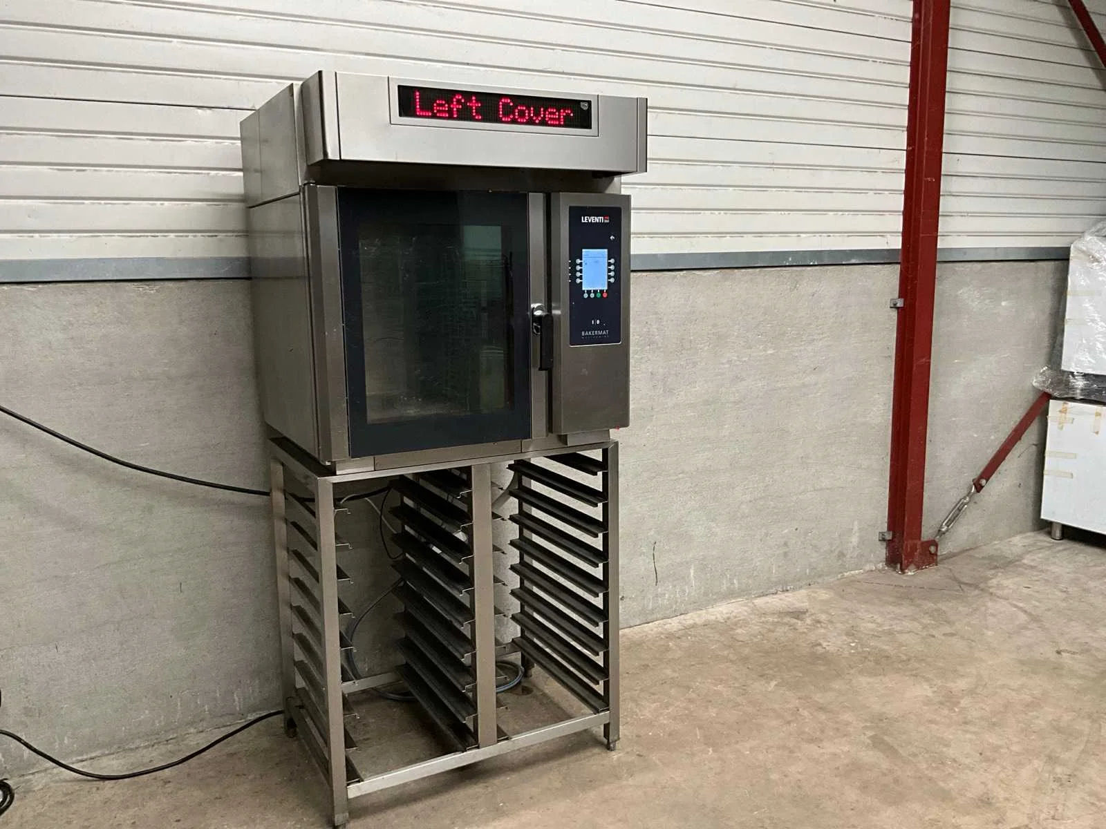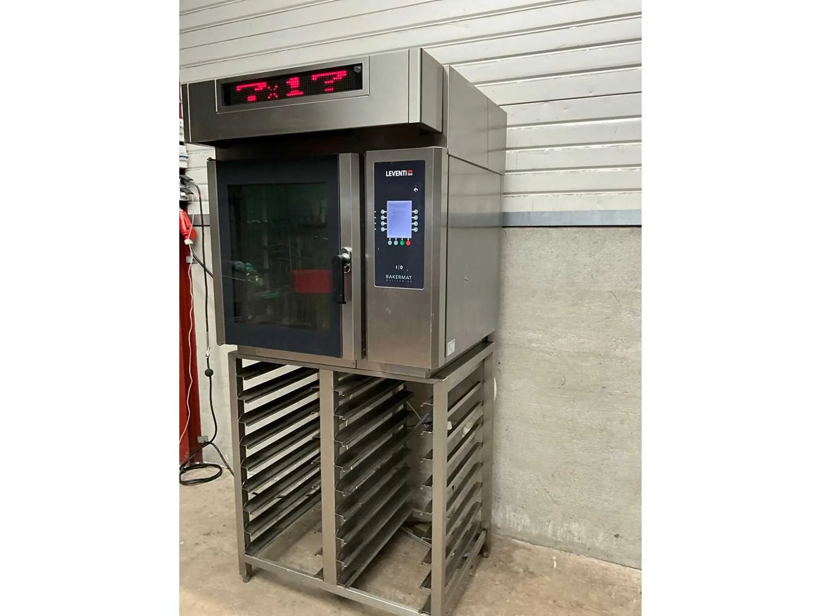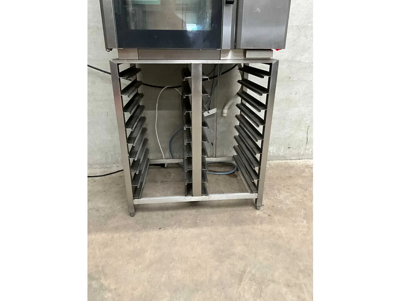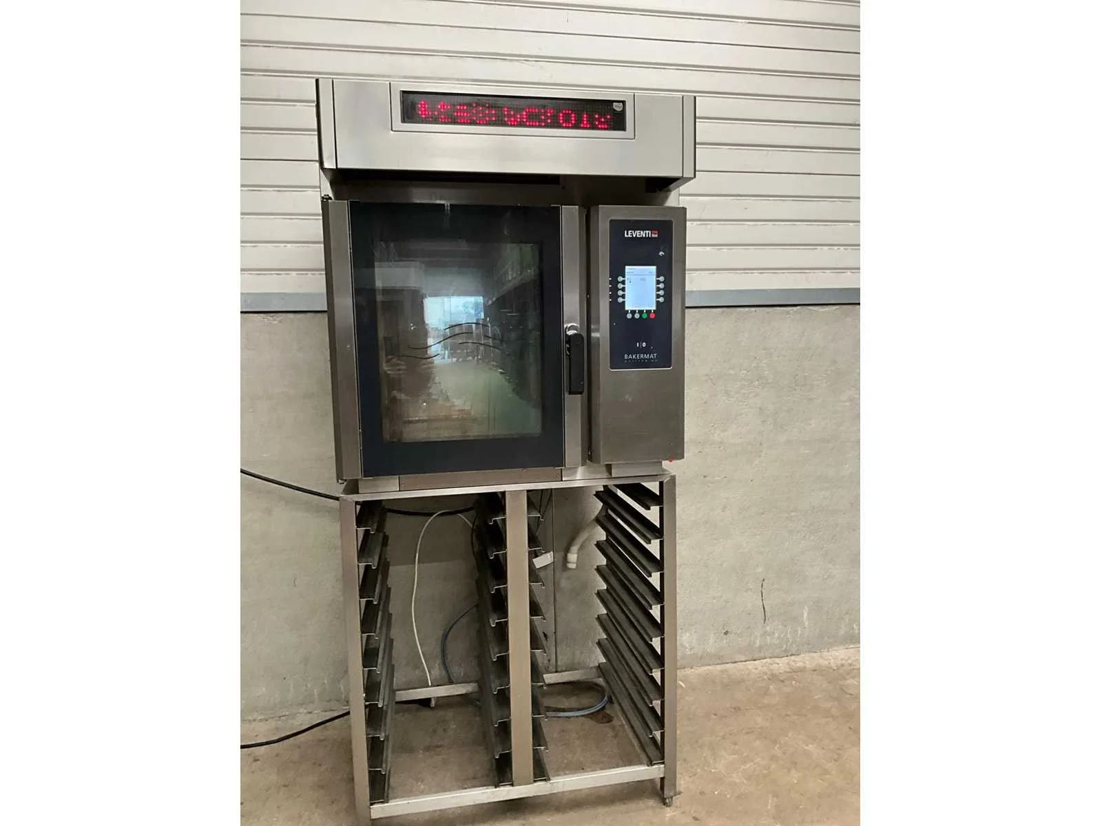 Rvs heteluchtoven met 6 regalen, voorzien van afzuigkap, op onderstel voorzien van 18 regalen Merk: Leventi Type: BM MM Q2 Aansluiting: 400V Elektrisch: true Rvs: true Totale afmeting L: 98cm Totale afmeting Breedte: 90cm Totale afmeting Hoogte: 206cm Met onderstel: true