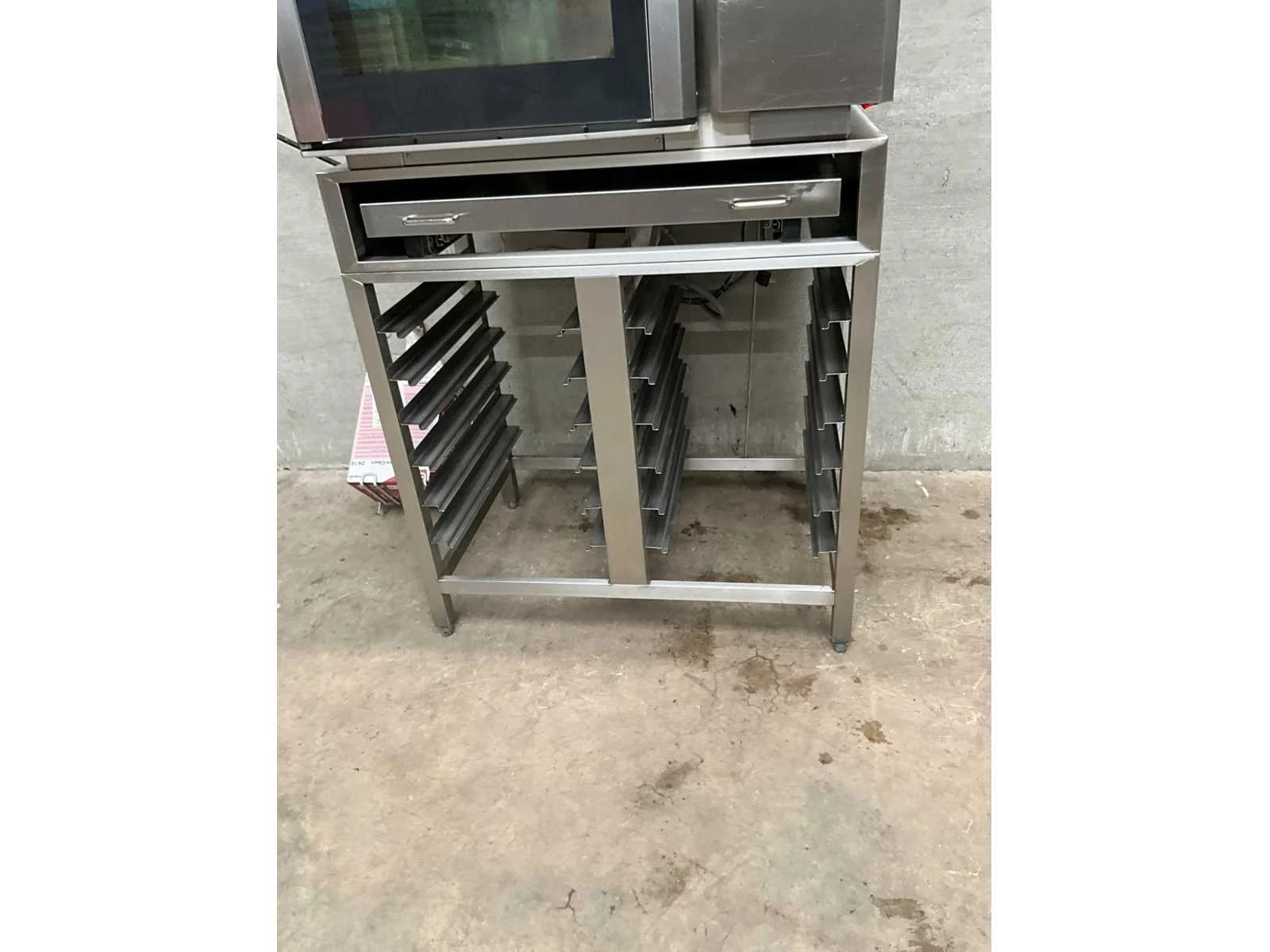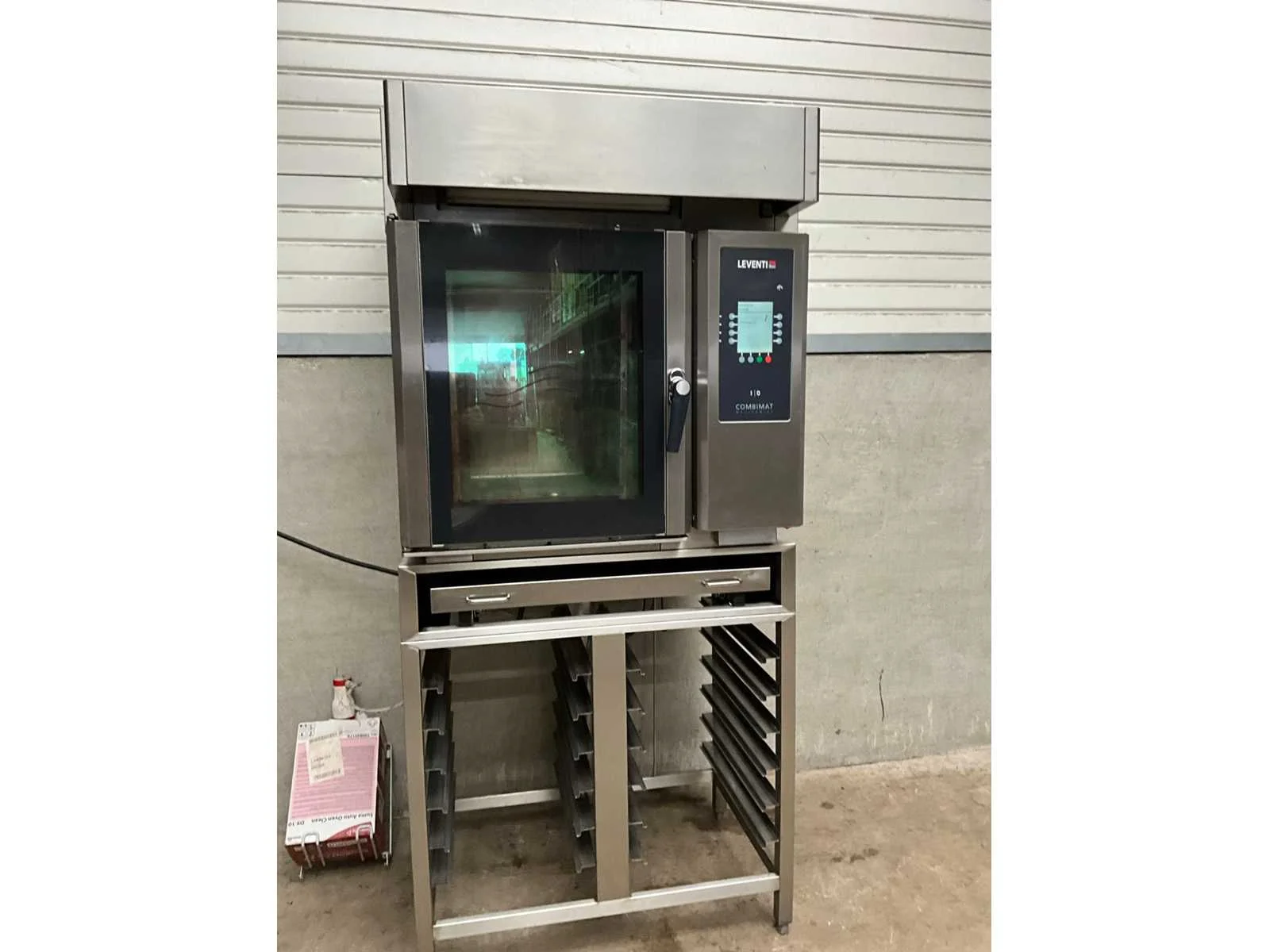Combi-steamer met 6 regalen, voorzien van afzuigkap, op onderstel voorzien van 12 regalen, voorzien van cleaning systeem Merk: Leventi Type: CM MM Q2 DI Aansluiting: 400V Elektrisch: true Rvs: true Totale afmeting L: 98cm Totale afmeting Breedte: 90cm Totale afmeting Hoogte: 206cm Met onderstel: true