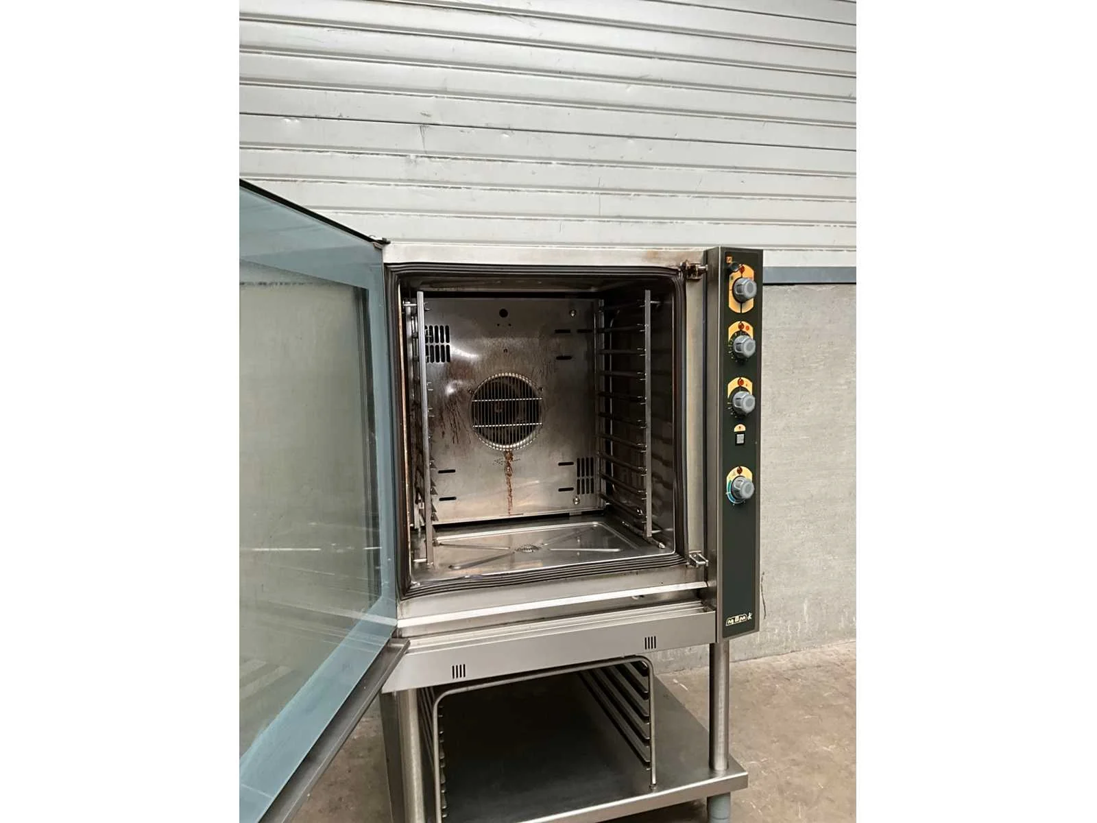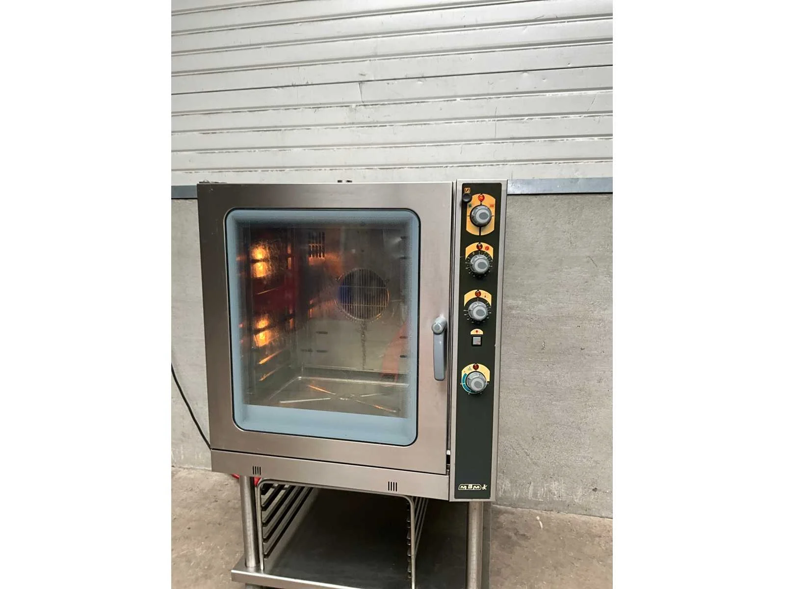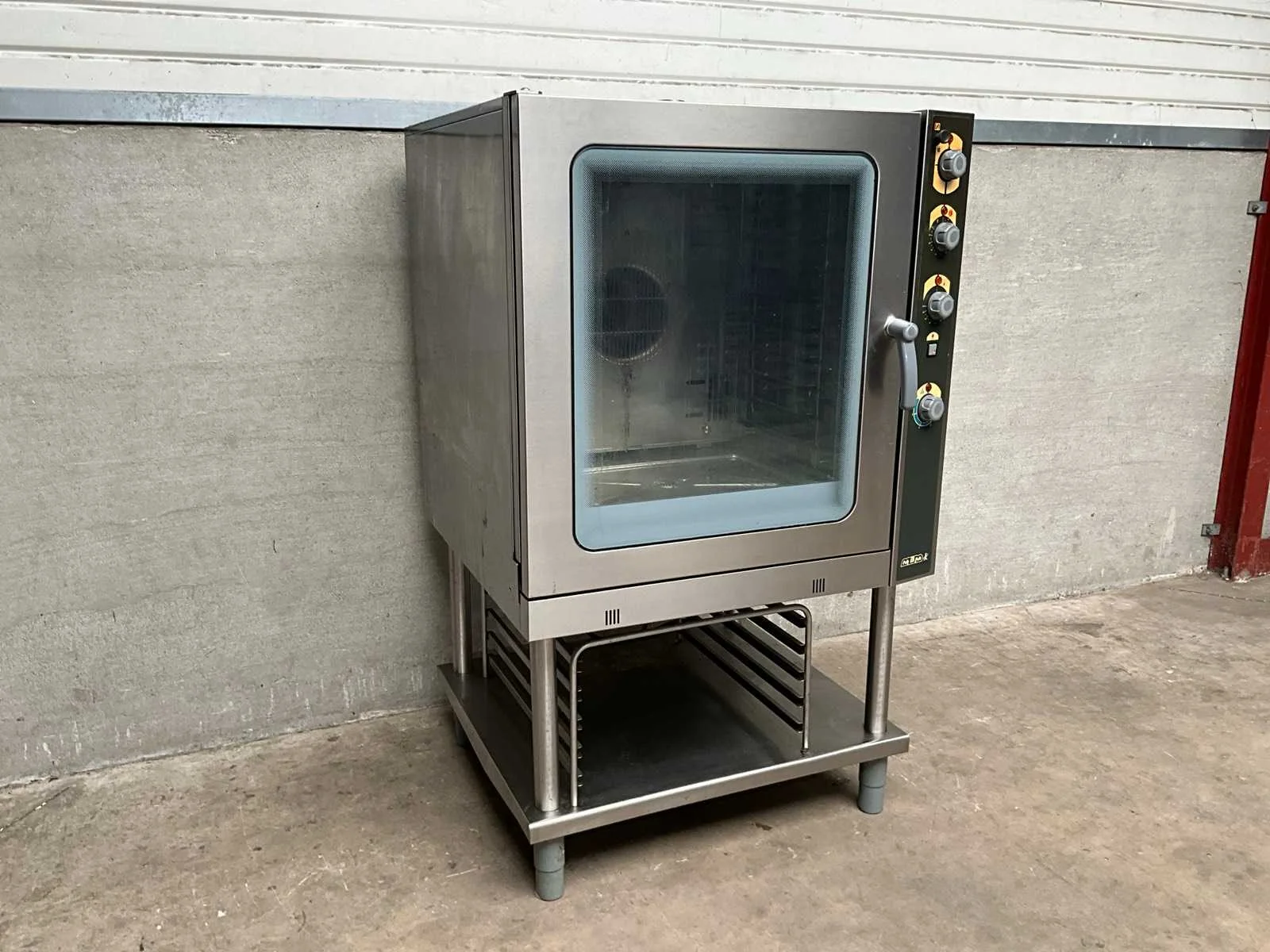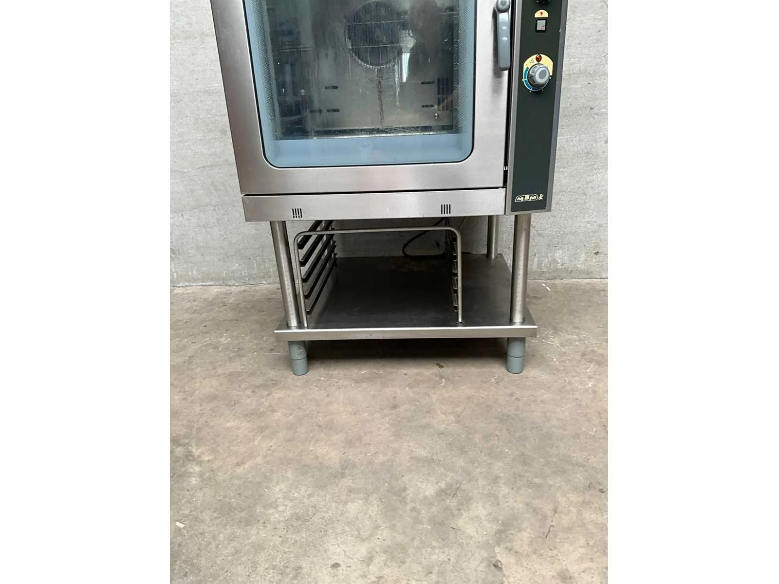 Elektrische convectieoven met stoombevochtiging voorzien van 10 regalen, op onderstel voorzien van 5 regalen Merk: MBM Type: FCE10 Aansluiting: 400V Elektrisch: true Rvs: true