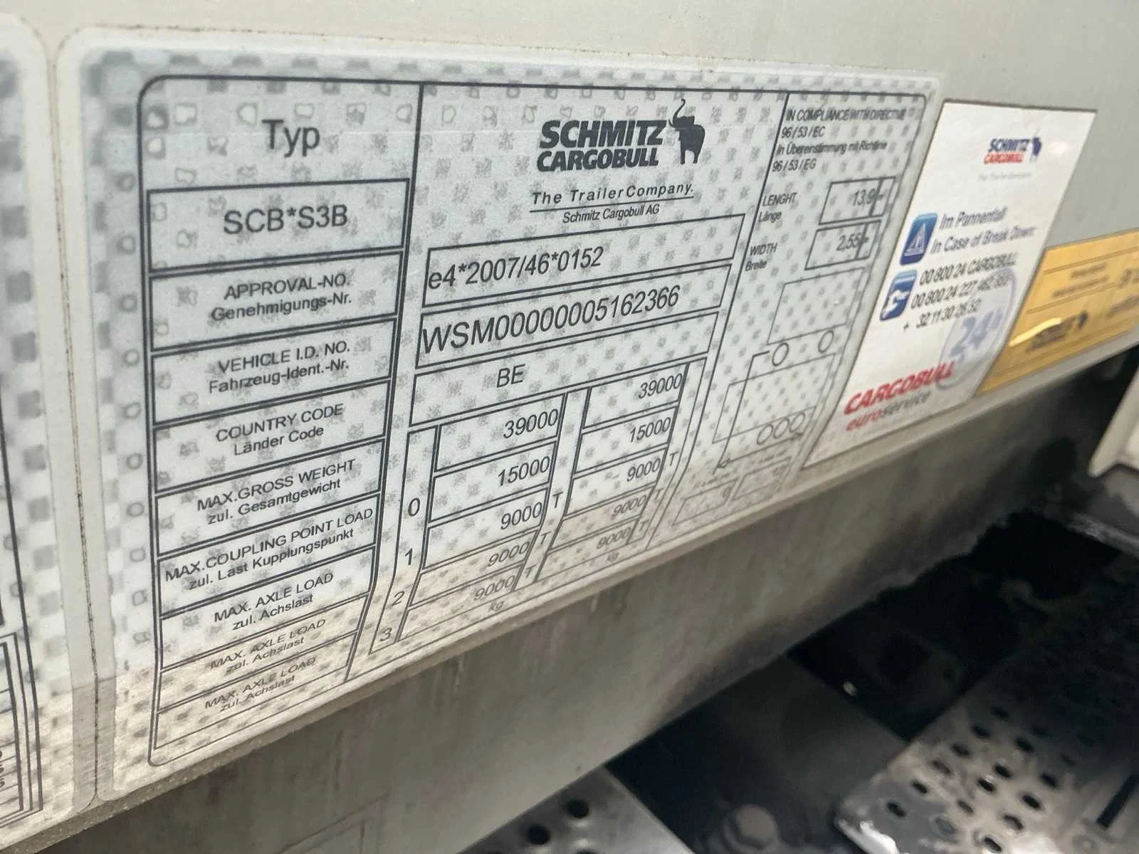 Belgische boorddocumenten compleet. MTM: 39000kg Merk: Schmitz Cargobull Type: SCB*S3B Type aanhangwagencarrosserie: Gesloten Bouwjaar: 2016 Chassisnummer VIN: WSM00000005162366 Datum eerste toelating: 14/06/2016 APK vervaldatum: 28/07/2026 Aantal assen: 3 Laadvermogen: 31890kg Eigen gewicht: 7110kg Totale afmeting L: 13900mm Totale afmeting Breedte: 2550mm Totale afmeting Hoogte: 4000mm