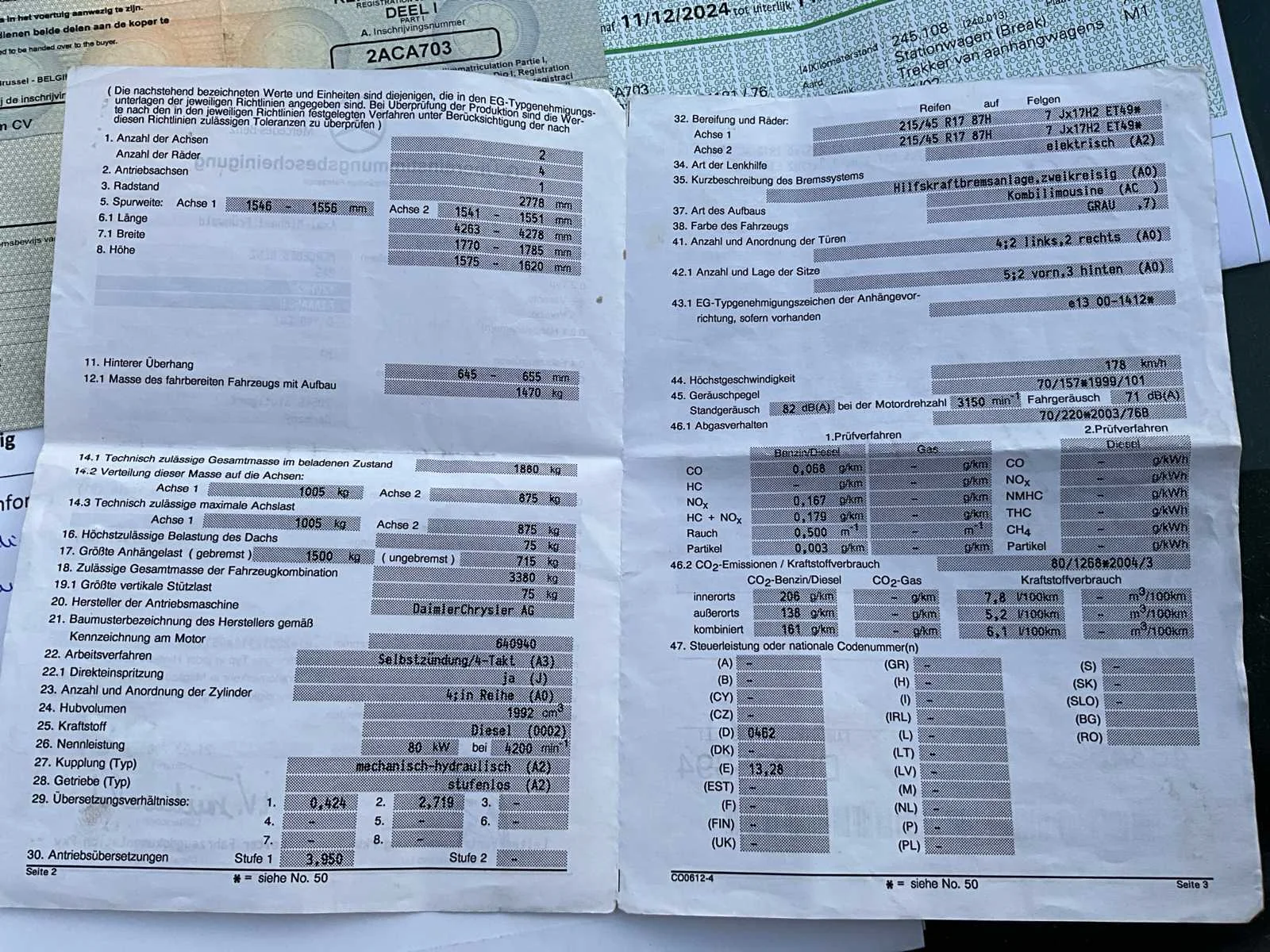 Belgische boorddocumenten enkel deel 2 inschrijving ontbreekt, trekhaak Kenteken: 2ACA703 Merk: Mercedes-Benz Type: B180 Bouwjaar: 2007 Afgelezen kilometerstand: 246587km Cilinderinhoud: 1992cc Vermogen (kW): 80kW Brandstof: Diesel Chassisnummer: WDD2452071J254181 Datum eerste toelating: 03-07-2007 Aantal zitplaatsen: 5 Kleur: Grijs Transmissie: Automaat Aantal deuren: 5 Aantal sleutels: 1 Nationaliteit documenten: Belgische
