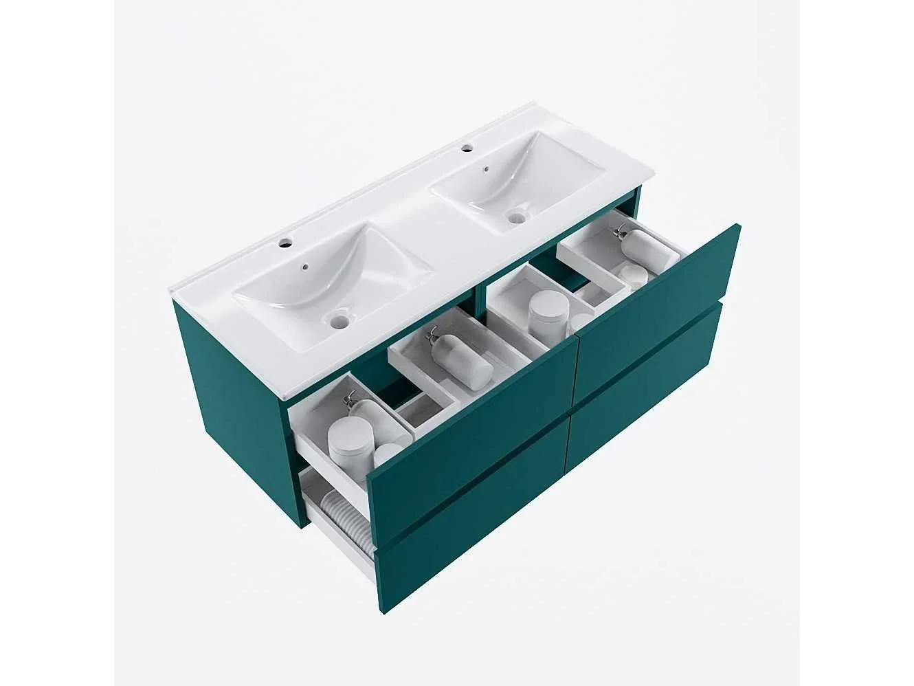 Badkamermeubel met dubbele keramische wastafel 120cm, 4 lades, softclose (alleen meubel en wastafel inbegrepen) Kleur: smaragd Lengte: 120cm Breedte: 45cm Hoogte: 50cm