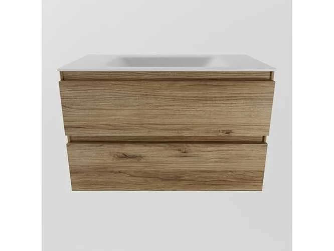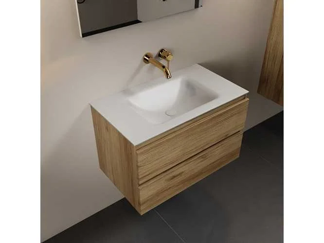 Badkamermeubel met solid surface (kunststeen) wastafel 80cm, zonder kraangat, 2 lades, toplaag kast eiken (alleen meubel en wastafel inbegrepen) Kleur: honey Lengte: 80cm Breedte: 45cm Hoogte: 50cm Materiaal: oak