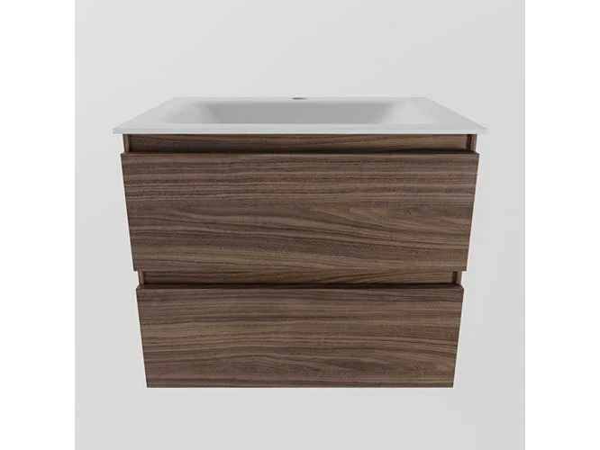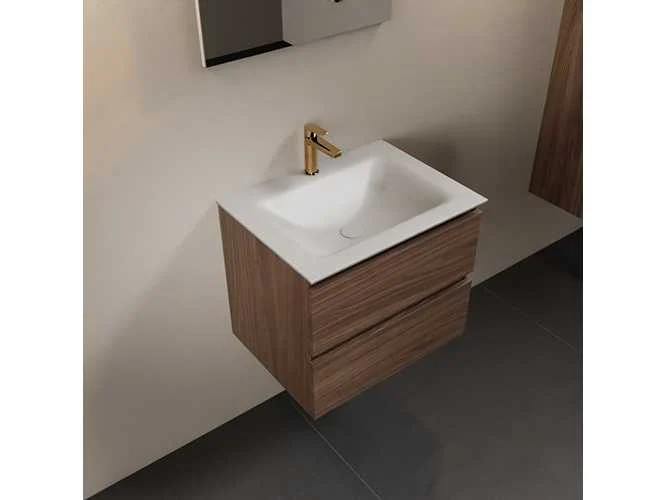Badkamermeubel met solid surface (kunststeen) wastafel 60cm, met kraangat, 2 lades, toplaag kast eiken (alleen meubel en wastafel inbegrepen) Kleur: mocha Lengte: 60cm Breedte: 45cm Hoogte: 50cm Materiaal: oak