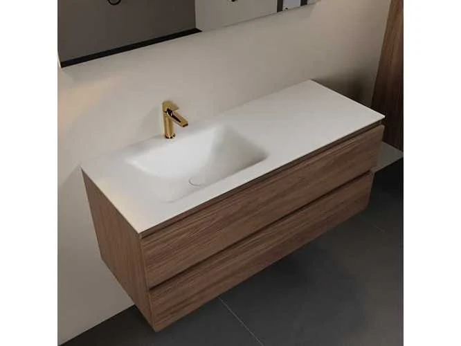 Badkamermeubel met solid surface (kunststeen) wastafel 120cm, met kraangat, 2 lades, toplaag kast eiken, positie wastafel : links (alleen meubel en wastafel inbegrepen) Kleur: mocha Lengte: 120cm Breedte: 45cm Hoogte: 50cm Materiaal: oak