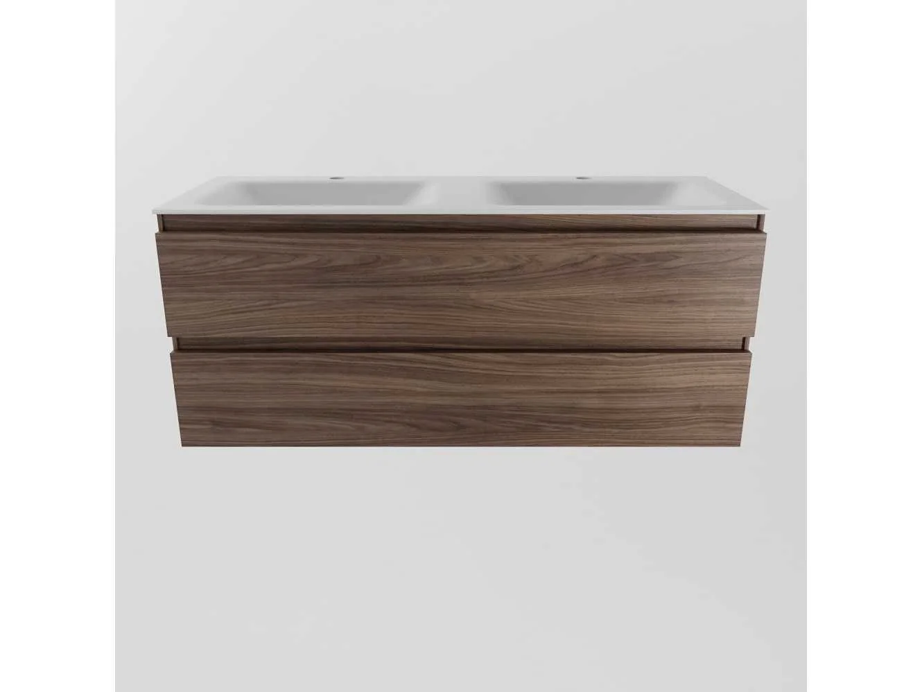 Badkamermeubel met solid surface (kunststeen) wastafel 120cm, met kraangat, 2 lades, toplaag kast eiken, positie wastafel : dubbel (alleen meubel en wastafel inbegrepen) Kleur: mocha Lengte: 120cm Breedte: 45cm Hoogte: 50cm Materiaal: oak