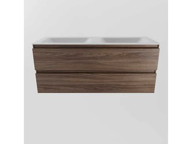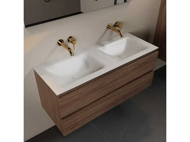 Badkamermeubel met solid surface (kunststeen) wastafel 120cm, zonder kraangat, 2 lades, toplaag kast eiken, positie wastafel : dubbel (alleen meubel en wastafel inbegrepen) Kleur: mocha Lengte: 120cm Breedte: 45cm Hoogte: 50cm Materiaal: oak