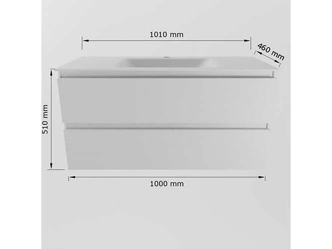 Badkamermeubel met solid surface (kunststeen) wastafel 100cm, zonder kraangat, 2 lades (alleen meubel en wastafel inbegrepen) Kleur: white Lengte: 100cm Breedte: 45cm Hoogte: 50cm