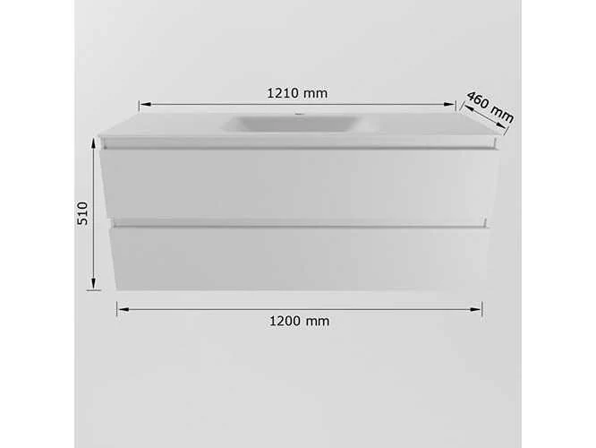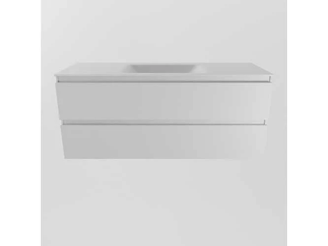 Badkamermeubel met solid surface (kunststeen) wastafel 120cm, zonder kraangat, 2 lades Positie wastafel : midden (alleen meubel en wastafel inbegrepen) Kleur: Wit Lengte: 120cm Breedte: 45cm Hoogte: 50cm