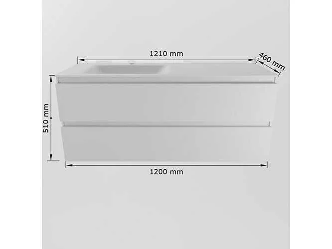 Badkamermeubel met solid surface (kunststeen) wastafel 120cm, zonder kraangat, 2 lades positie wastafel : links (alleen meubel en wastafel inbegrepen) Kleur: white Lengte: 120cm Breedte: 45cm Hoogte: 50cm