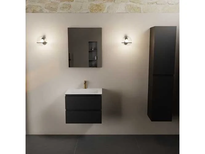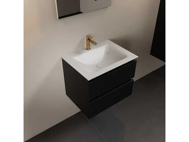 Badkamermeubel met solid surface (kunststeen) wastafel 60cm, met kraangat, 2 lades (alleen meubel en wastafel inbegrepen) Kleur: black Lengte: 60cm Breedte: 45cm Hoogte: 50cm