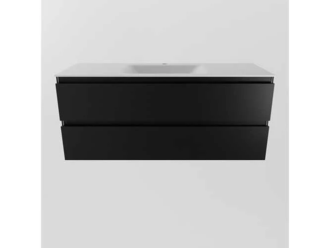Badkamermeubel met solid surface (kunststeen) wastafel 120cm, met kraangat, 2 lades Positie wastafel : midden (alleen meubel en wastafel inbegrepen) Kleur: black Lengte: 120cm Breedte: 45cm Hoogte: 50cm
