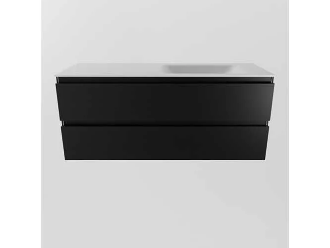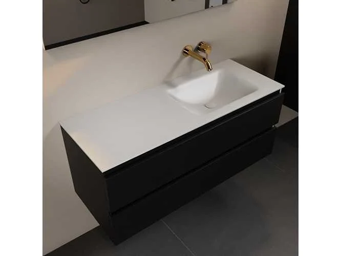 Badkamermeubel met solid surface (kunststeen) wastafel 120cm, zonder kraangat, 2 lades positie wastafel : rechts (alleen meubel en wastafel inbegrepen) Kleur: zwart Lengte: 120cm Breedte: 45cm Hoogte: 50cm