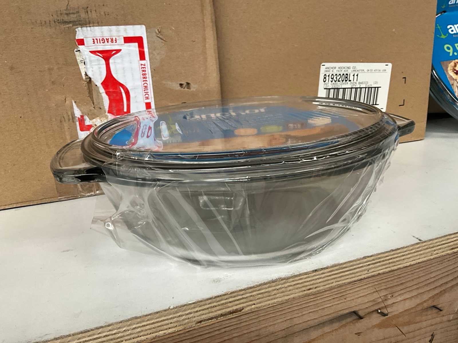 Kavel bestaande uit; 11x ovenschaal met deksel, 8x ovenschaal zonder deksel. Merk: Anchor Hocking Materiaal: Glas