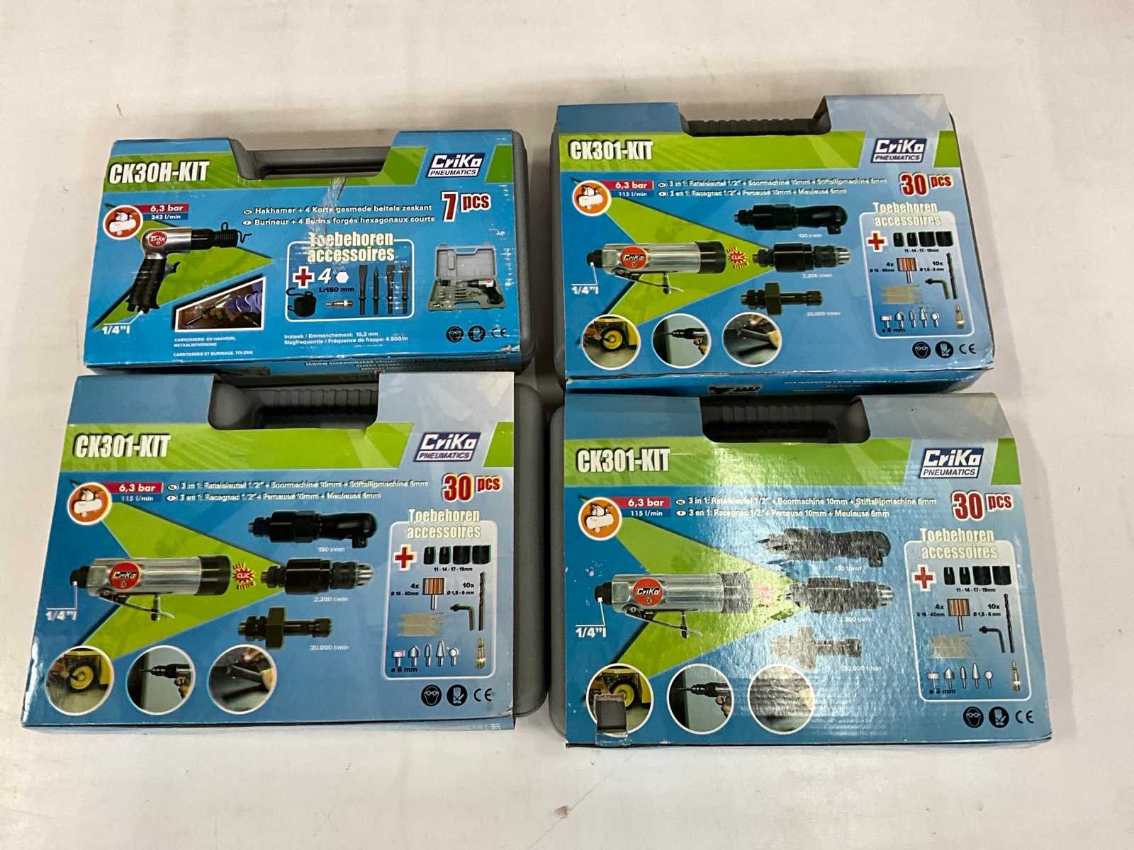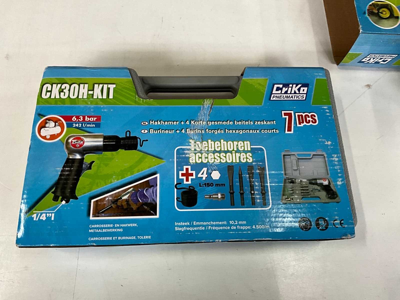 Kavel bestaande uit; 3x Criko CK301 3 in 1 kit ratelsleutel 1/2”, boormachine 10 mm, stiftslijpmachine 6 mm. 1x Criko CK30H hakhamer kit.