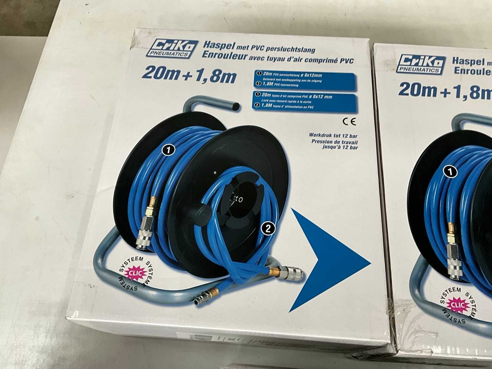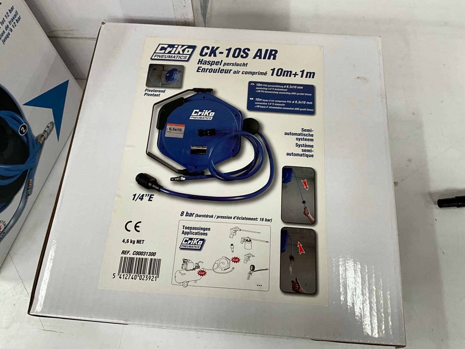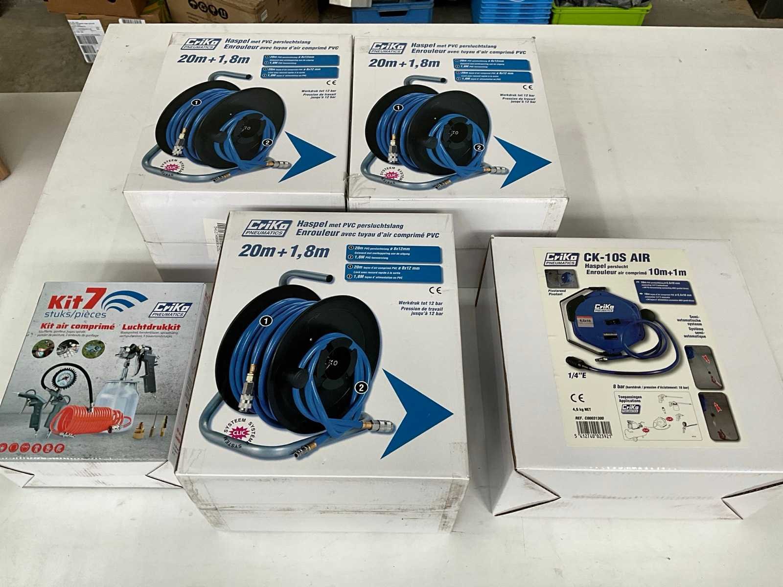 Kavel bestaande uit; 3x CK15 Air haspel met pvc persluchtslang 20 m, 1x luchtdrukkit, 1x CK-10S Air haspel perslucht. Merk: Criko