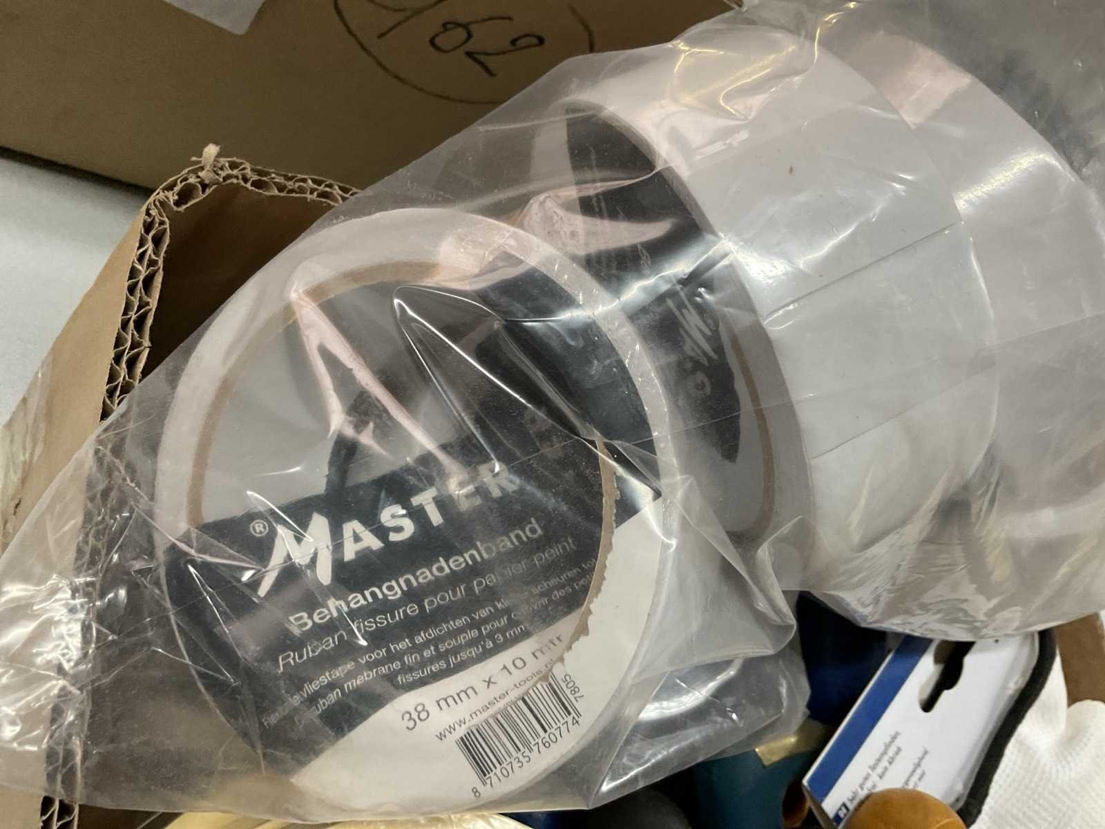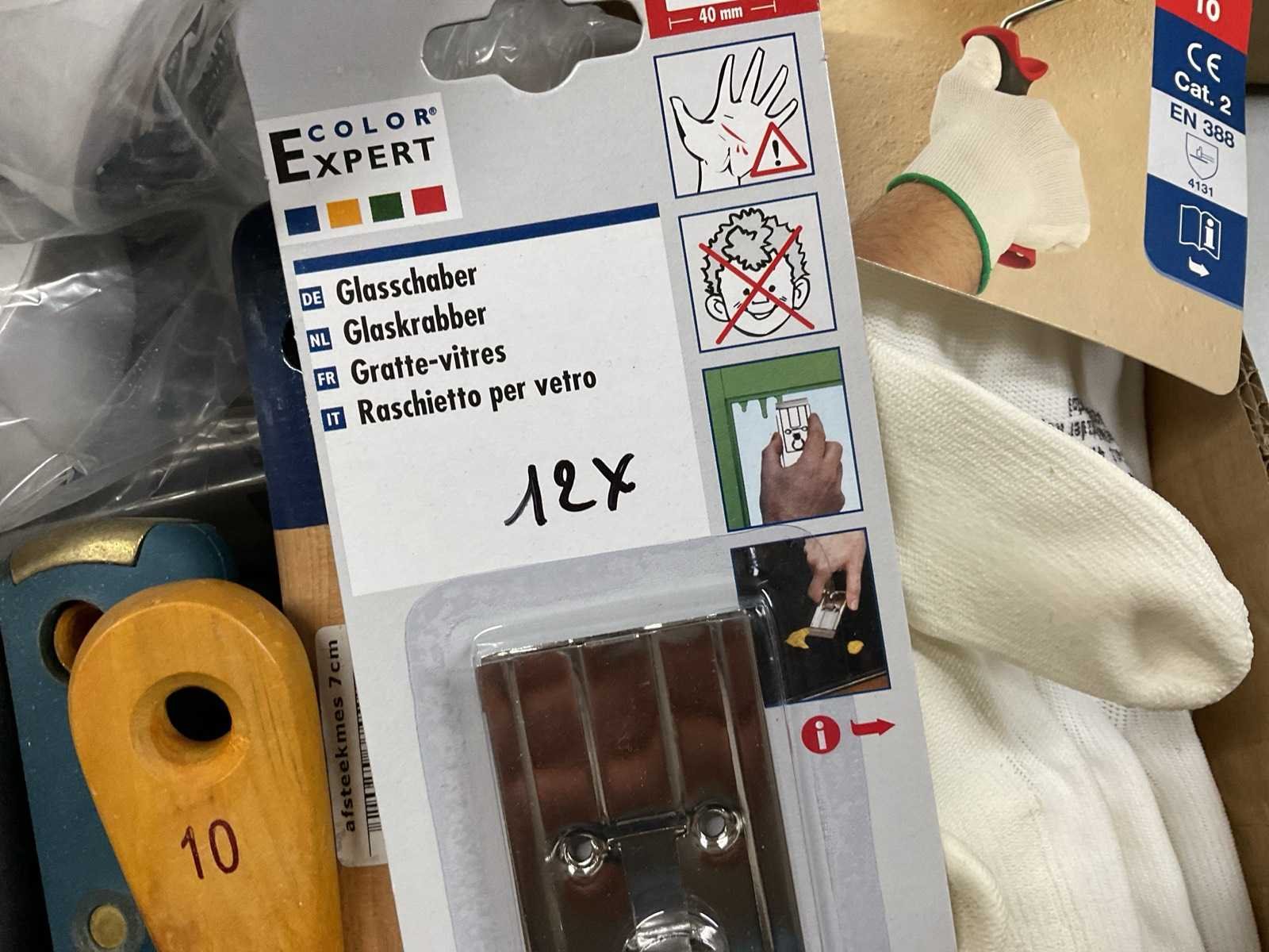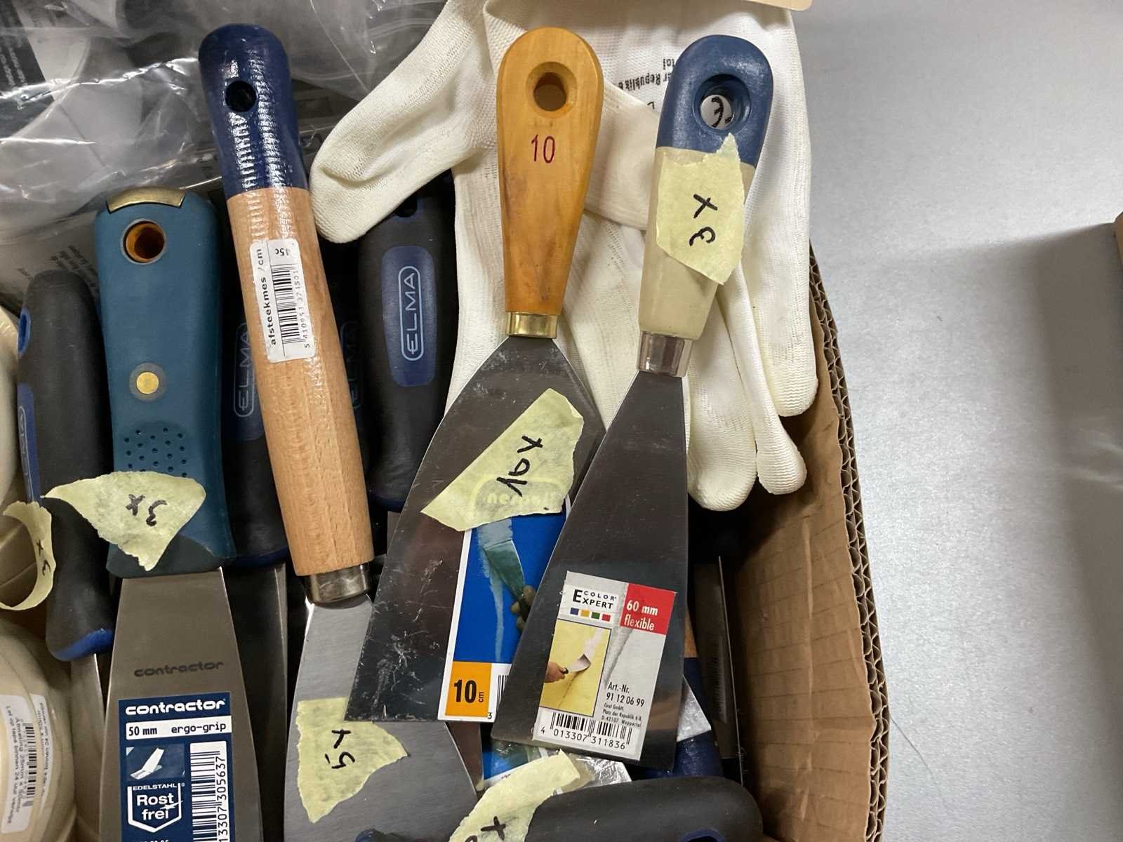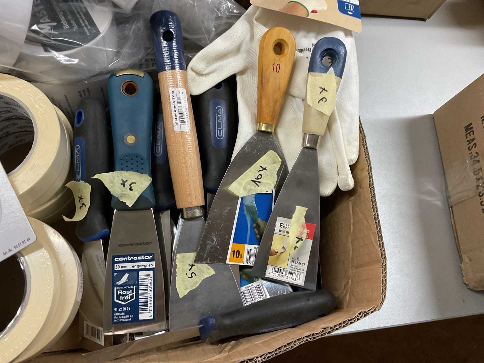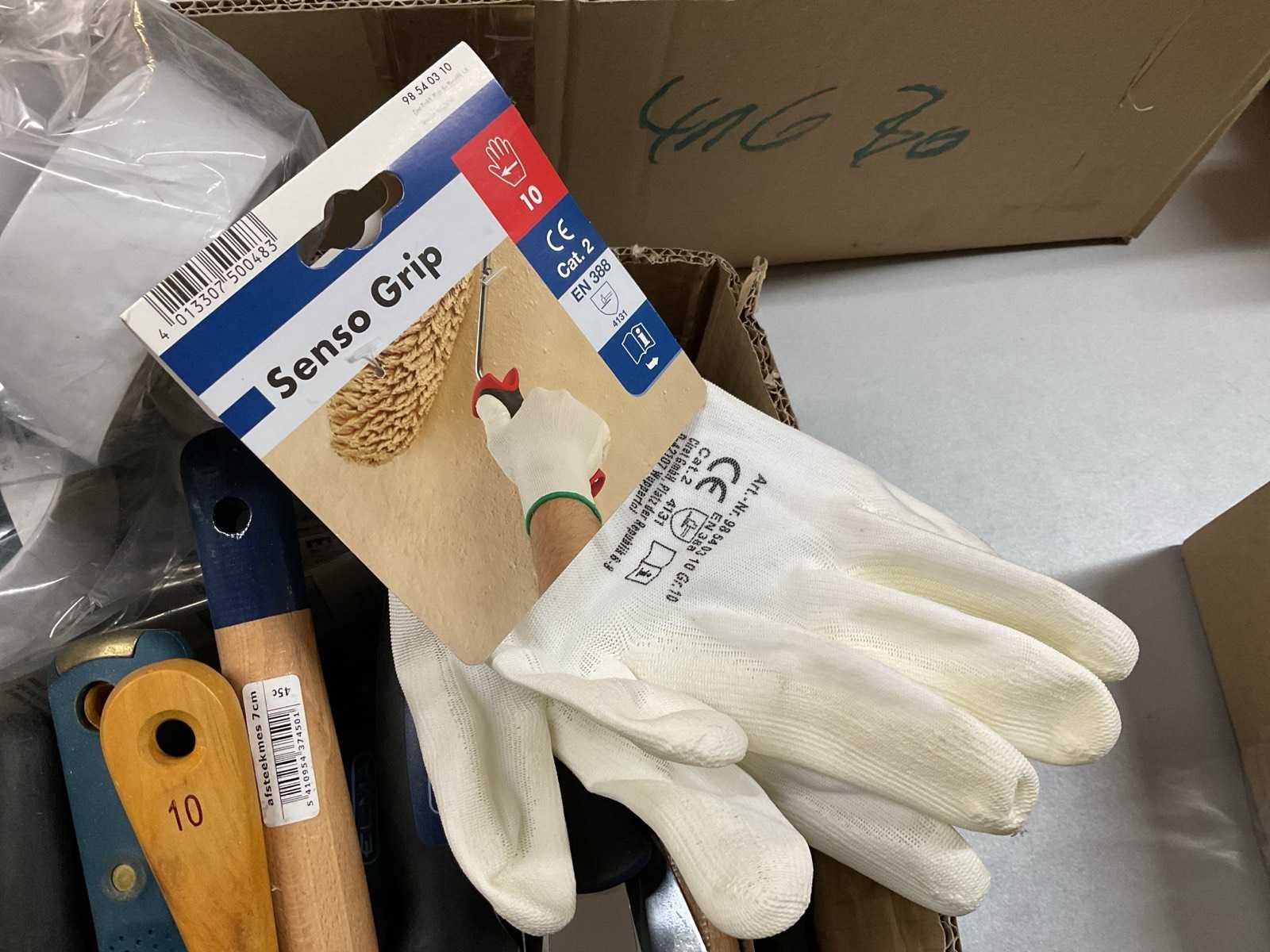 Plamuurmessen; verfhandschoenen; behangnadenband; tape; glaskrabber
