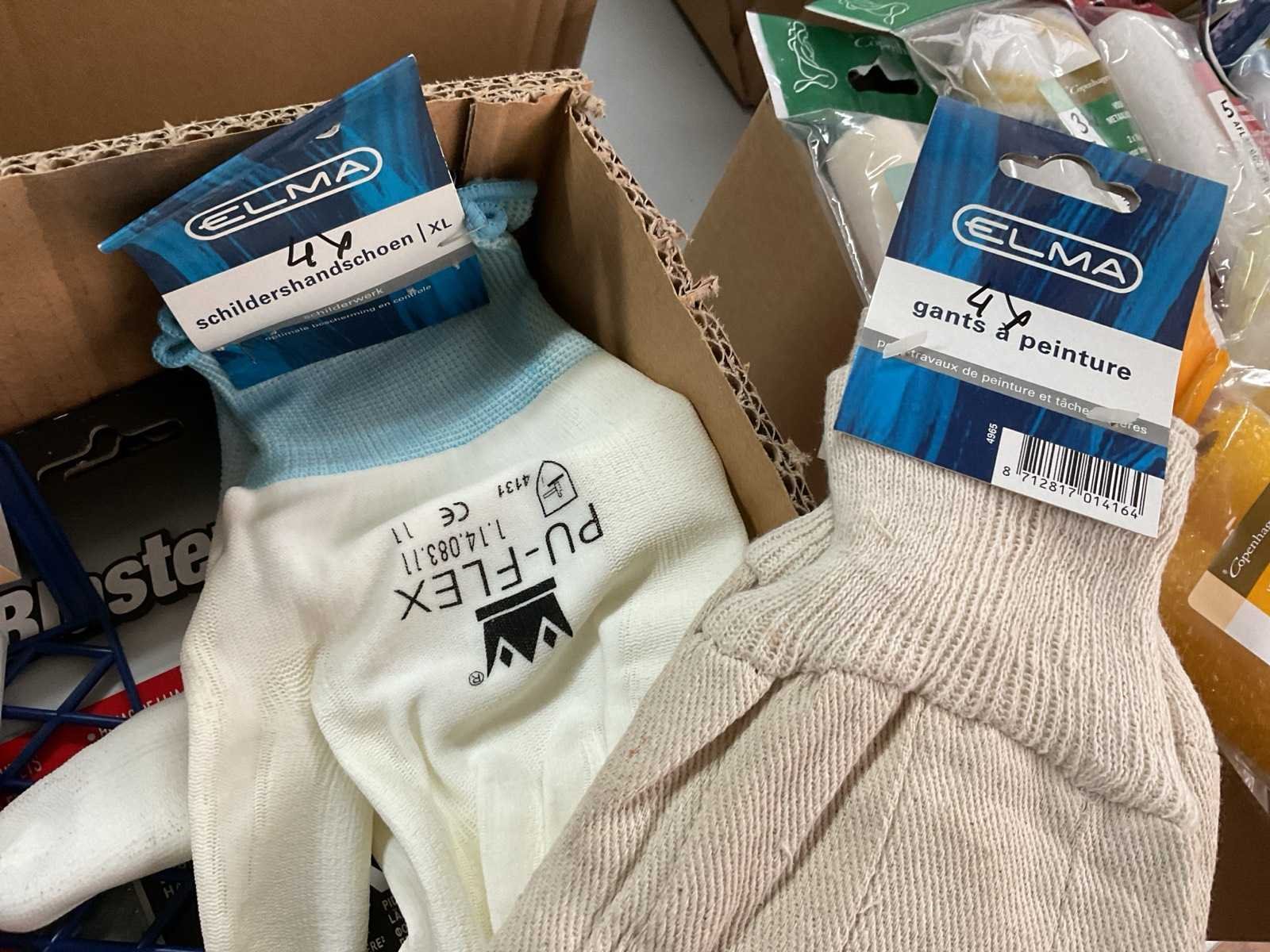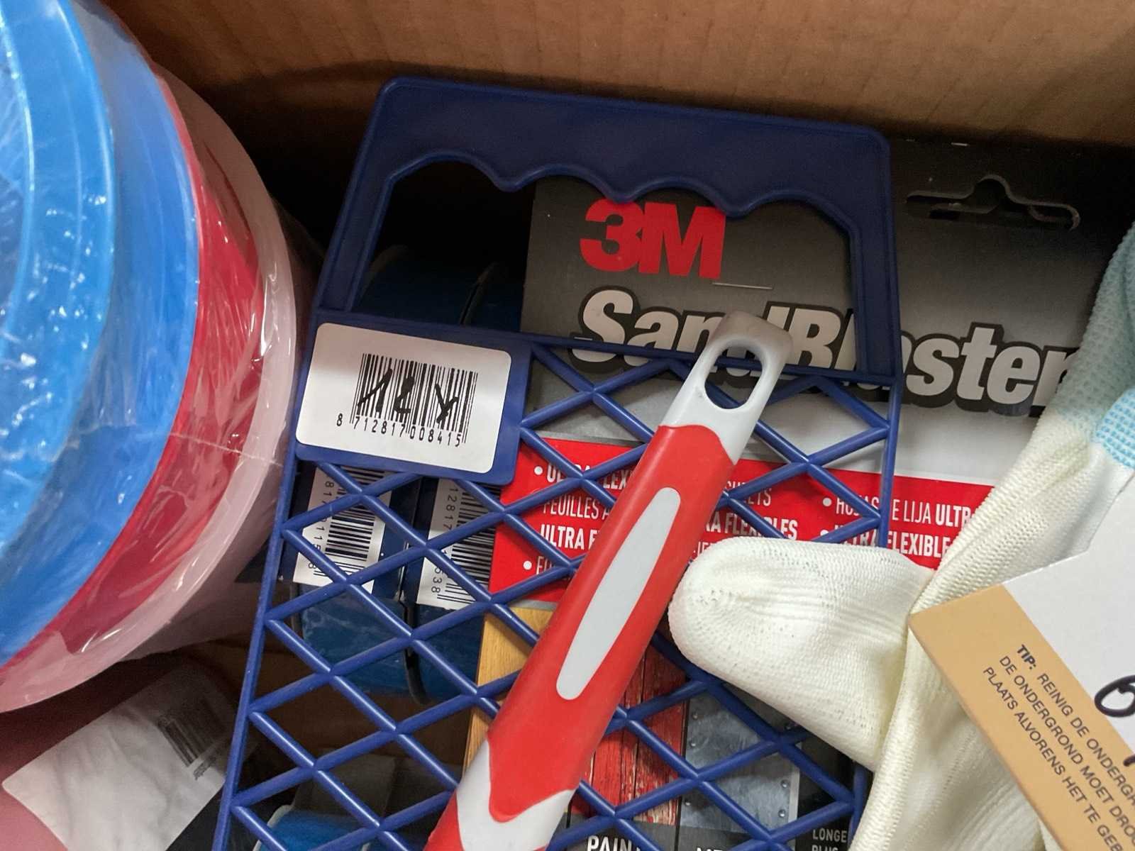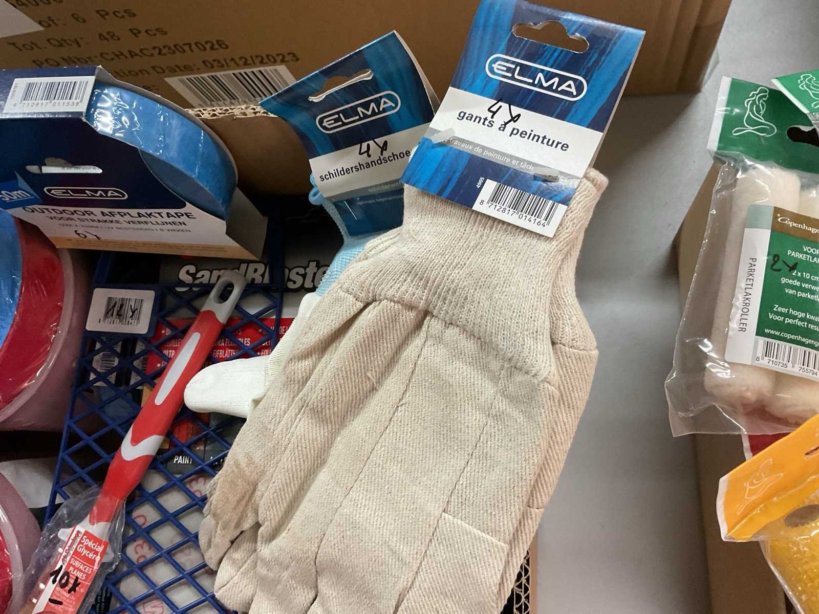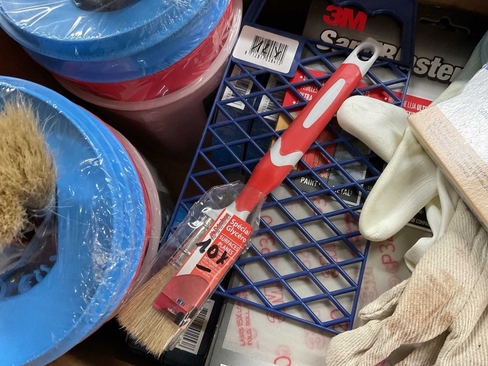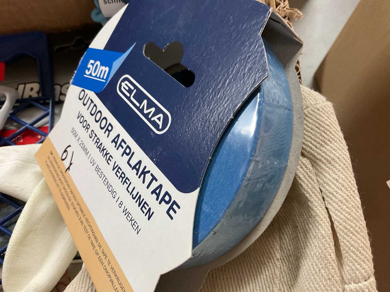 Afplaktape; verfreservoir pot; schildershandschoen; schuurpapier; kwasten