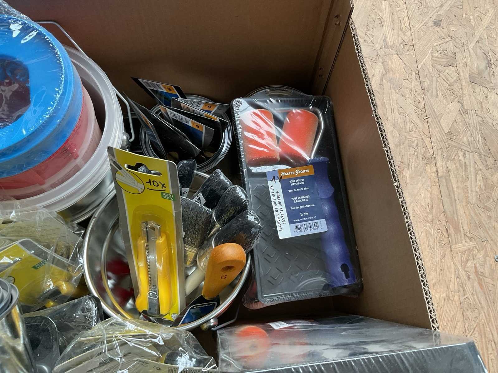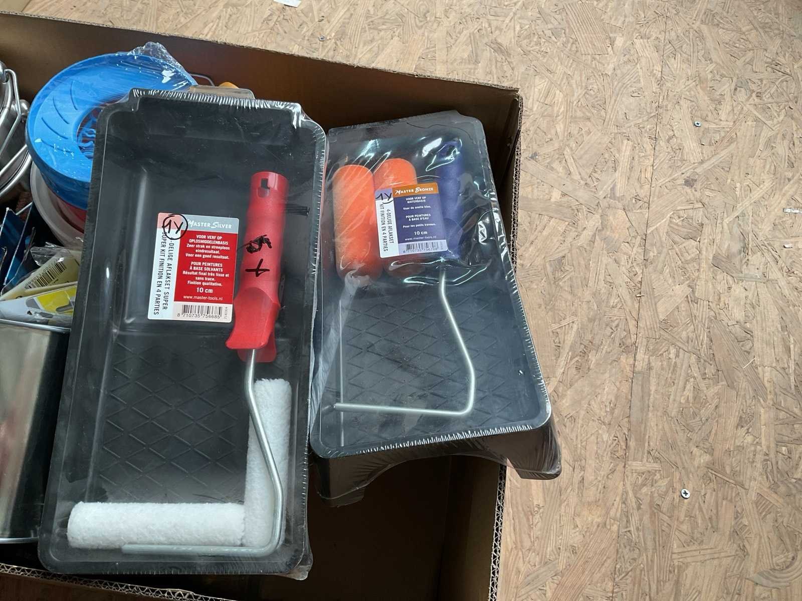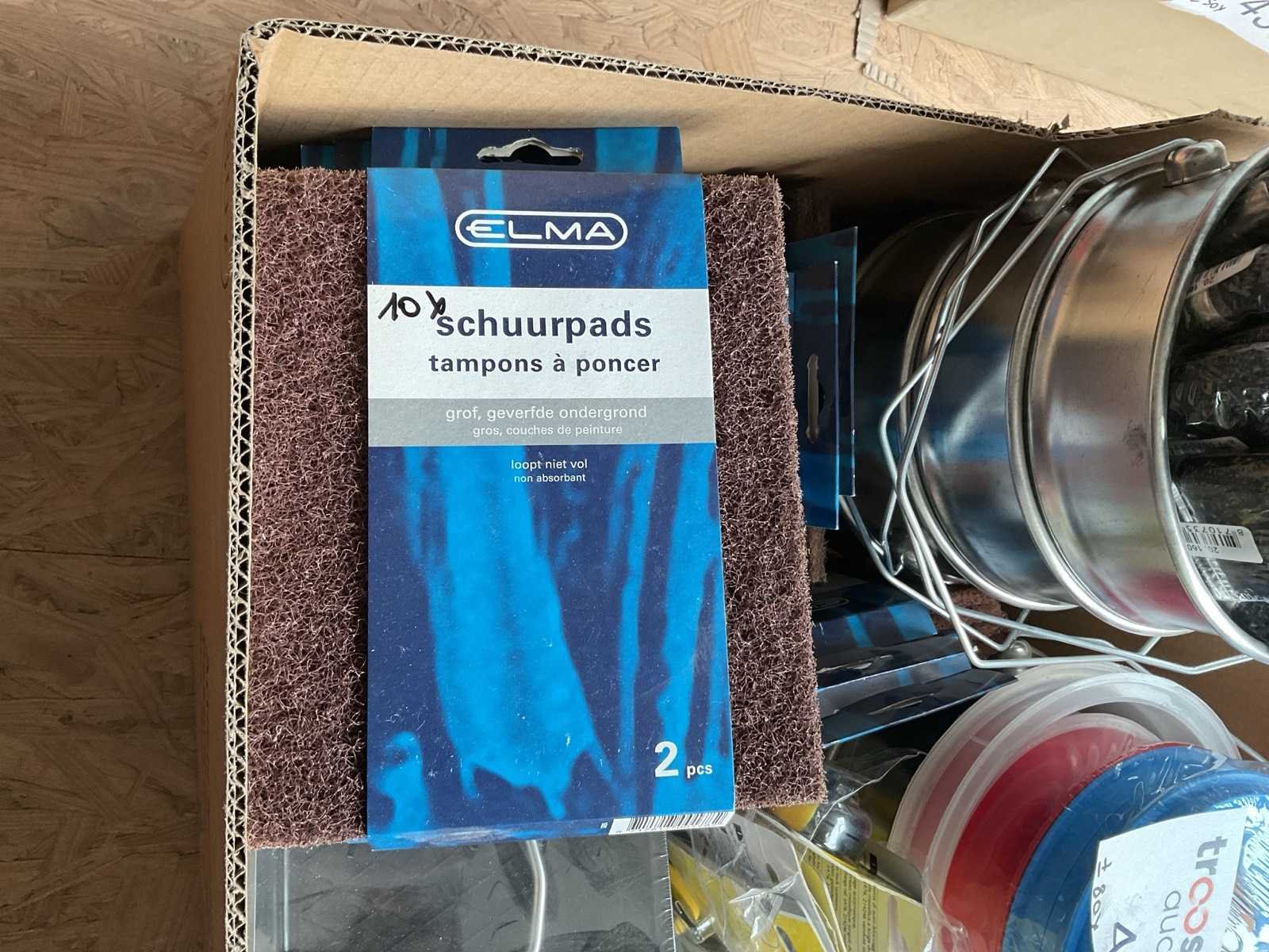 Verfpot; verfkwasten; snijmessen; plamuurmessen; verfrolset; schuurpads