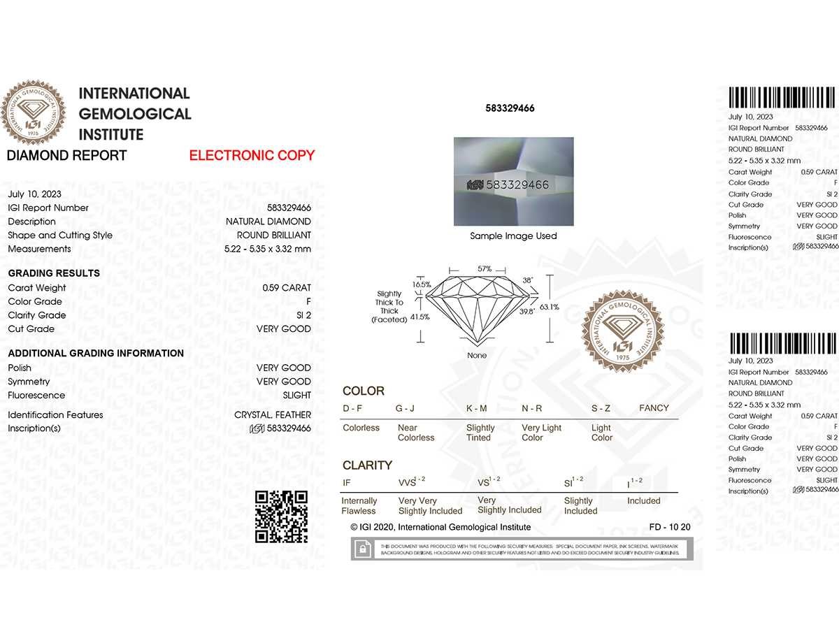 Ronde briljant geslepen - natuurlijke gedolven diamant met IGI-certificaat, 0,59 cts. Kleur F, Clarty SI2. Diamant heeft inscriptie op de gordel om te bevestigen dat het met certificaat is. De diamant zal met het Igi-Certificaat van de Steen worden ingesloten, zal het verschepen van Antwerpen, België, de Diamanthoofdstad van de Wereld zijn. Certificaat nr. 583329466 Historische verkoopprijs: €4999. Al Onze Kavels Worden Verzonden In Fedex Dozen Door Hoge Prioriteit. U ontvangt snel een trackingcode nadat u voor de veilingkavels heeft betaald. Het wordt meestal binnen 7-14 dagen verzonden en de levering vindt plaats in 24-48 uur daarna. De kavels zijn verzekerd en vooruitbetaald door de verkoper. Within 14 days Voornaamste diamant: Natural Mined Diamond Kleur diamant: F Gewicht diamant: 0.59ct Slijpvorm diamant: Round Brilliant Cut Zuiverheidsgraad diamant: SI2