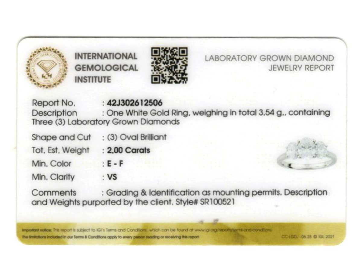 Aantal items-1, Metaal-Goud, Totaal Bruto Gewicht- 3.54, Bezet met: Lab gekweekte diamanten, Aantal diamanten: 3, Totaal karaatgewicht: 2, Diamanten Zuiverheid: VS, Diamanten Vorm/slijpvorm: Ovaal Briljant, Diamanten Kleur: EF, Conditie: Nieuw, EU-54, US-7, UK-N1/2 (Diameter-17.2mm), Goudzuiverheidskeurmerk op het sieraad, Ontwerpcode: SR100521, Verpakking: Sieradendoosje met certificaatkaart, Historisch Verkoopprijs: € 2997. Goud staat op recordhoogtes ooit. Deze productie zijn nieuwe of ongebruikte sieraden. Het werd echter gemaakt in een lagere goudprijs dan vandaag en we verhogen de prijzen niet - aanbevolen detailhandelsprijzen of geschatte prijzen zijn gebaseerd op HISTORISCHE goudprijzen. Het betekent dat het goud wordt verdisconteerd als u de kosten van vandaag weerspiegelt. Al onze kavels worden verzonden in Fedex-dozen met hoge prioriteit. U ontvangt een trackingcode kort nadat u de veilingkavels heeft betaald. Het wordt meestal binnen 7-14 dagen verzonden en de levering vindt plaats in 24-48 uur daarna. De kavels zijn verzekerd en vooruitbetaald door de verkoper. Within 14 days Materiaal: Gold Kleur: White Gold Voornaamste diamant: Lab Grown Diamonds Gewicht diamant: 2.0ct Totaal gewicht: 3.54g Kleur diamant: EF Zuiverheidsgraad diamant: VS