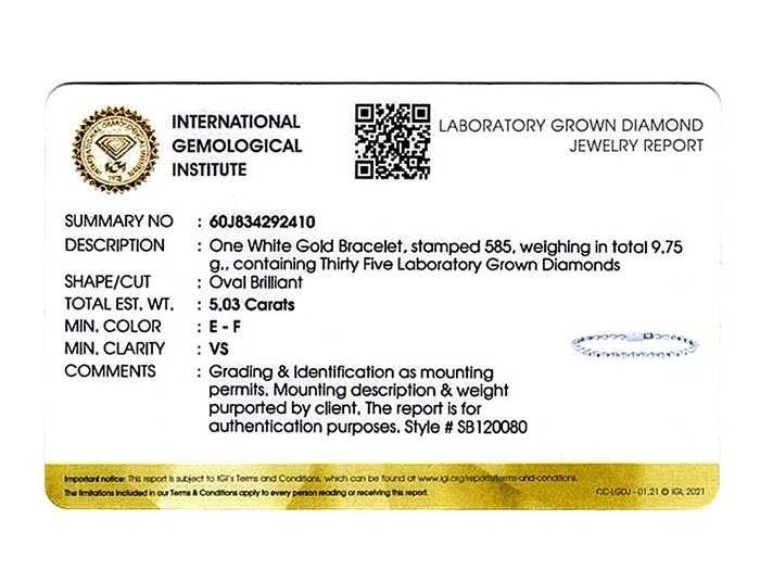 Aantal items-1, Metaal-Goud, Totaal Bruto Gewicht- 9.75, Bezet met: Fancy Coloured Lab Grown Diamonds, Aantal Diamanten: 35, Totaal karaatgewicht: 5.03, Diamanten Zuiverheid: VS, Diamanten Vorm/Slijpvorm: Ovaal Geslepen, Diamanten Kleur: EF, Staat: Nieuw, Lengte: - 18cm, Goudzuiverheidskeurmerk op het sieraad, Ontwerpcode: SB120080, Verpakking: Juwelendoosje met certificaatkaart, Historisch Verkoopprijs: €8345.Goud is op recordhoogtes ooit. Deze productie zijn nieuwe of ongebruikte sieraden. Het werd echter gemaakt in een lagere goudprijs dan vandaag en we verhogen de prijzen niet - aanbevolen detailhandelsprijzen of geschatte prijzen zijn gebaseerd op HISTORISCHE goudprijzen. Het betekent dat het goud wordt verdisconteerd als u de kosten van vandaag weerspiegelt. Al onze kavels worden verzonden in Fedex-dozen met hoge prioriteit. U ontvangt een trackingcode kort nadat u de veilingkavels heeft betaald. Het wordt meestal binnen 7-14 dagen verzonden en de levering vindt plaats in 24-48 uur daarna. De kavels zijn verzekerd en vooruitbetaald door de verkoper. Within 14 days Materiaal: Gold Kleur: White gold Voornaamste diamant: Lab Grown Diamonds Kleur diamant: EF Gewicht diamant: 5.03ct Zuiverheidsgraad diamant: VS Totaal gewicht: 9.75g