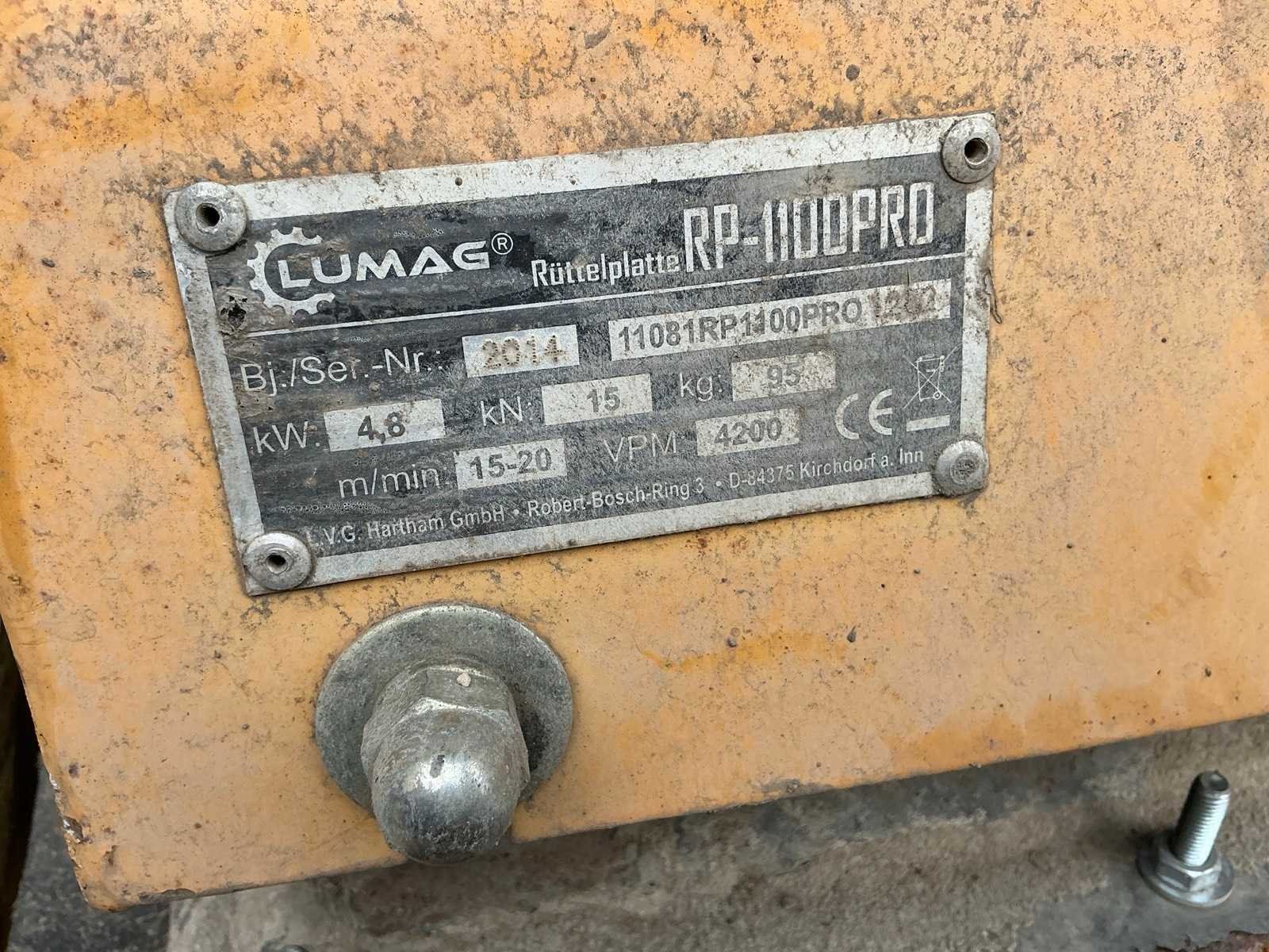 Merk: Lumag Type: RP-1100pro Grondplaat afm. l: 550mm Grondplaat afm. b: 440mm Centrifugale kracht: 15kN Motorvermogen (kW): 4.8kW Eigen gewicht: 95kg